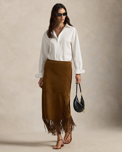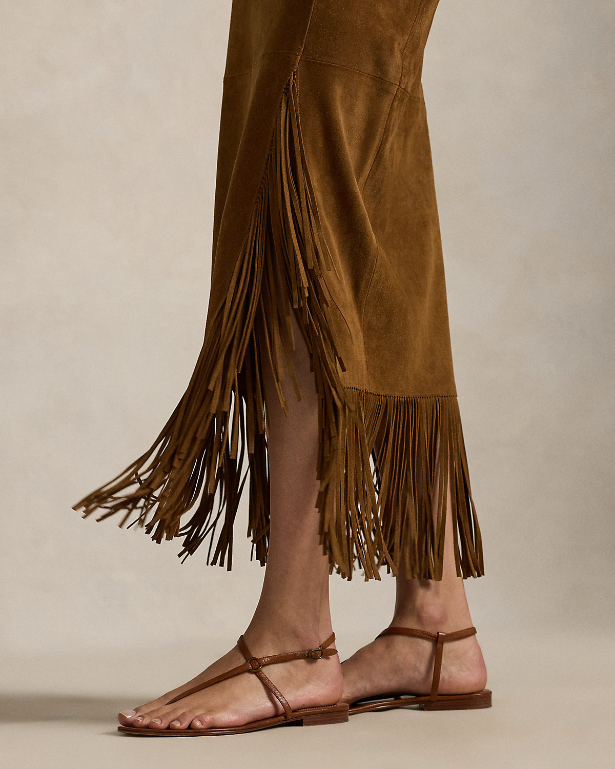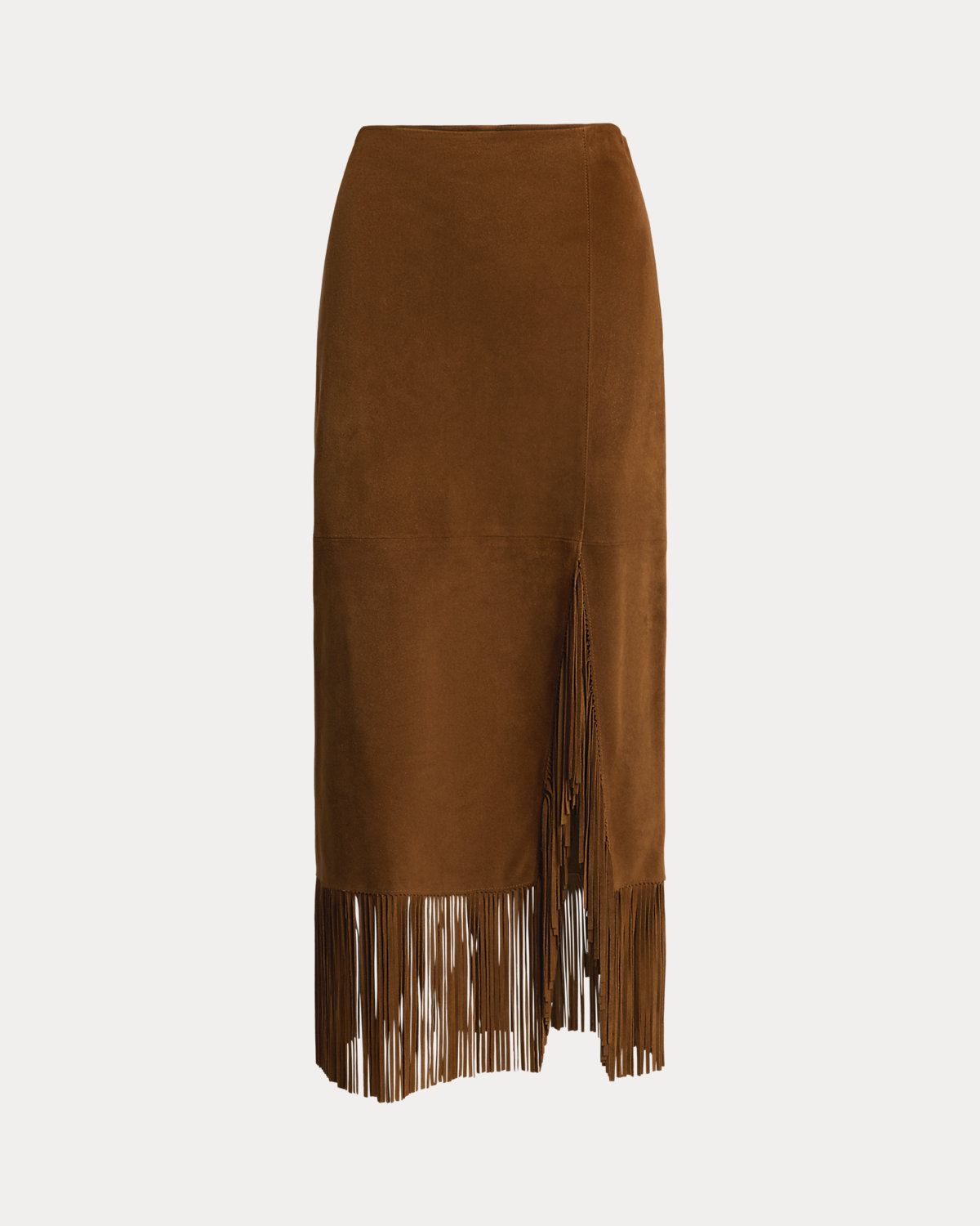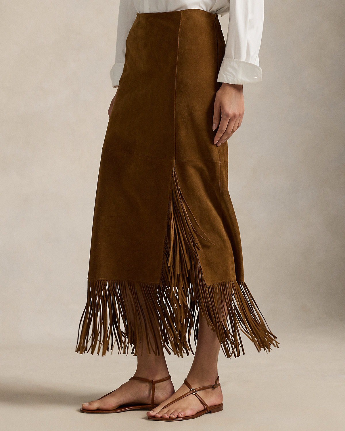 Expertly tailored in rich, velvety suede, this skirt features a paneled construction that contours through the waist and hips before releasing into fluid fringe trim.