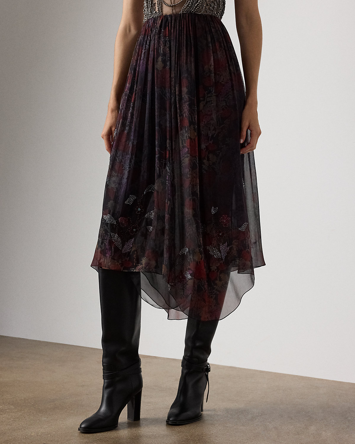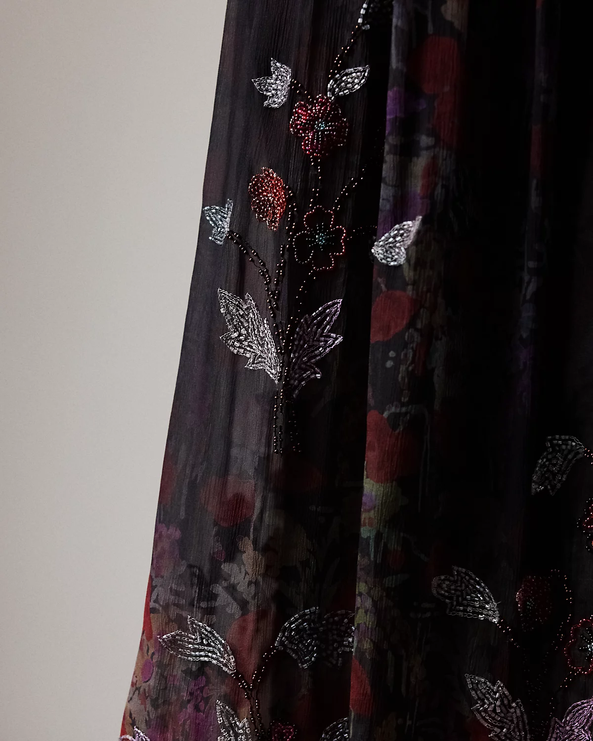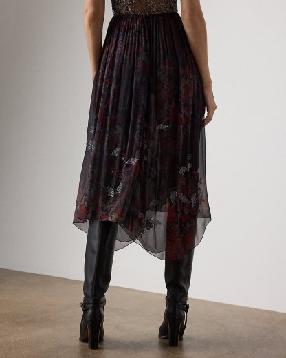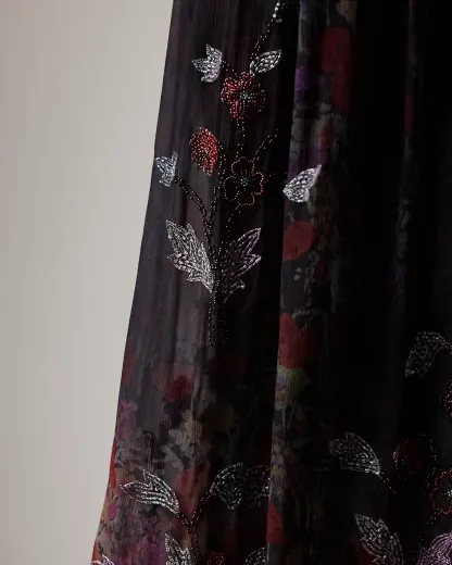 Evoking the season’s theme of modern romance, the Gabriella skirt is crafted in Italy from airy crinkle chiffon printed with one of the season’s dark floral motifs, which features a smoky effect for subtle movement with each step. Utilizing a long-needle hand-embroidery technique, four master artisans applied a collection of vibrant, multicolored glass beads and satin cuts, forming artful florals that add texture and dimension to the Gabriella’s beautiful pattern. Delicate shirring and a handkerchief hem complete the look.
