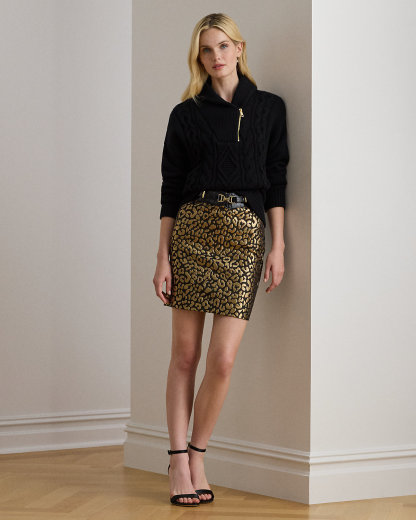 This eye-catching take on the pencil miniskirt showcases a metallic ocelot jacquard motif, creating a bold statement piece.