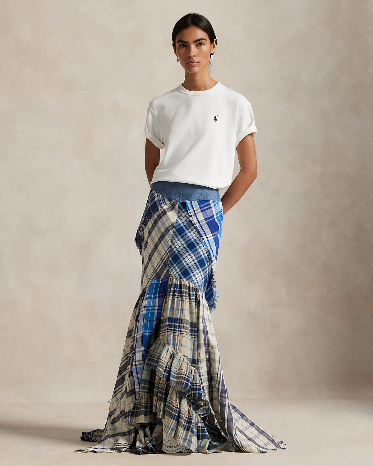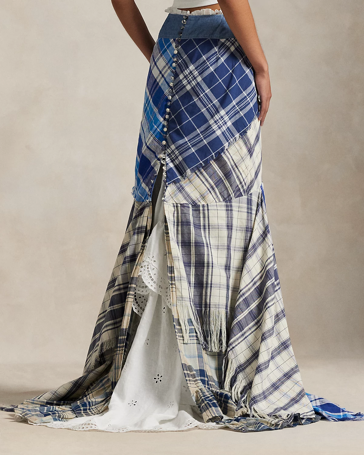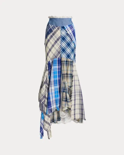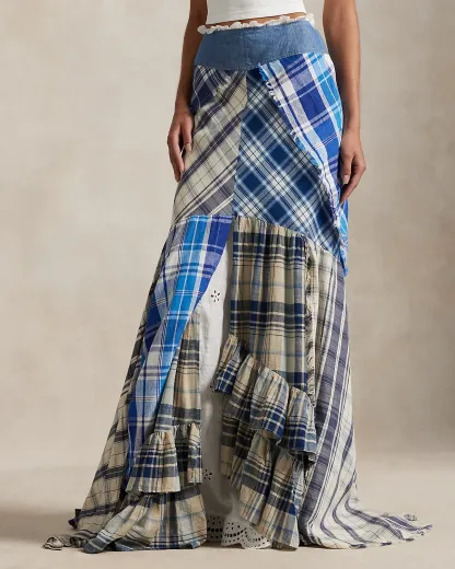 Inspired by a piece from the Spring 2025 runway show, this patchwork maxiskirt artfully combines frayed-edge plaid fabric, reminiscent of scarves, to create its paneled fit-and-flare silhouette. A decorative div-and-loop placket adorns the back and beneath is a cotton petticoat with eyelet embroidery and ruffled godets, adding volume and textural depth to the design.