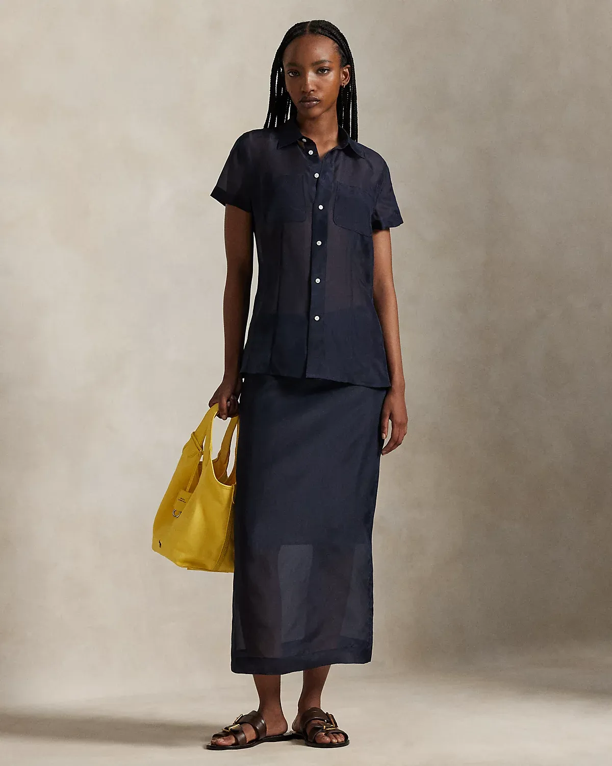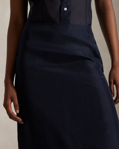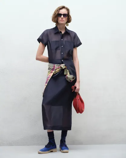 This pencil skirt joins sheer mulberry silk organza with an opaque knee-length lining. Waist darts and a vented hem create a tailored silhouette while maintaining the fabric’s lightweight fluidity.