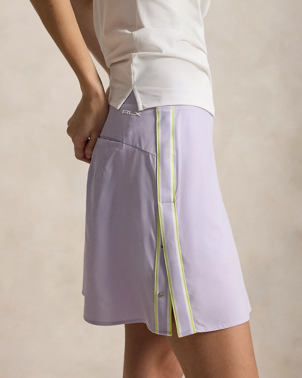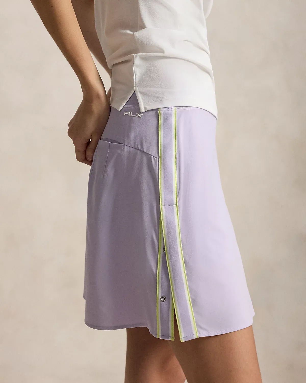 Designed for superior comfort and mobility, this skort is made from a refined stretch fabric with moisture-wicking properties. It features a snapped placket at each side and is finished with our signature silicone-printed “RLX” logo at the hem.