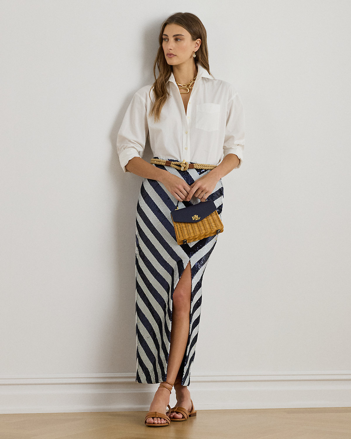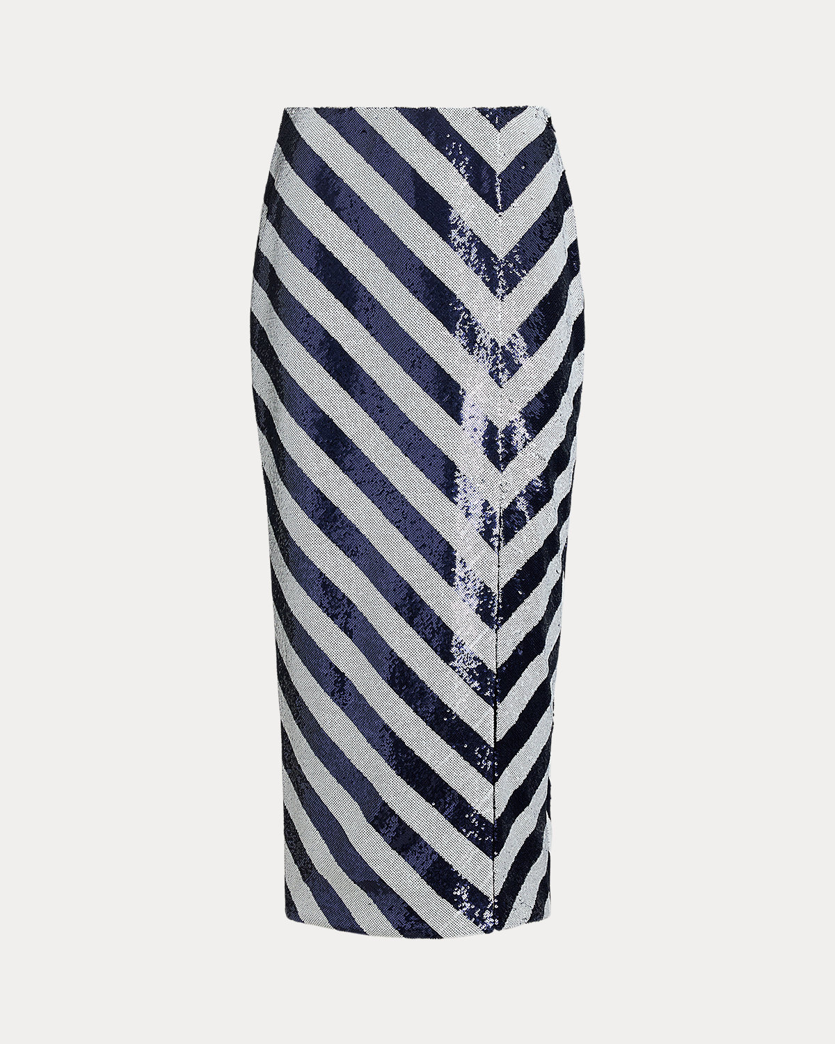 A striking arrangement of blue-and-white sequined stripes bring a modern, nautical-inspired sensibility to this pencil midi skirt, which is finished with a slit along the princess seam for ease of movement.