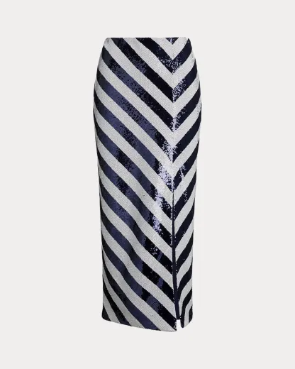 A striking arrangement of blue-and-white sequined stripes bring a modern, nautical-inspired sensibility to this pencil midi skirt, which is finished with a slit along the princess seam for ease of movement.