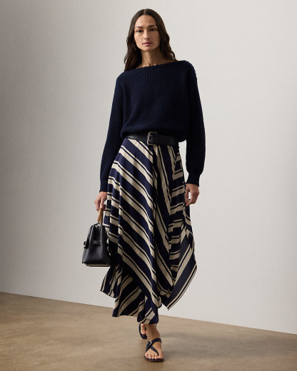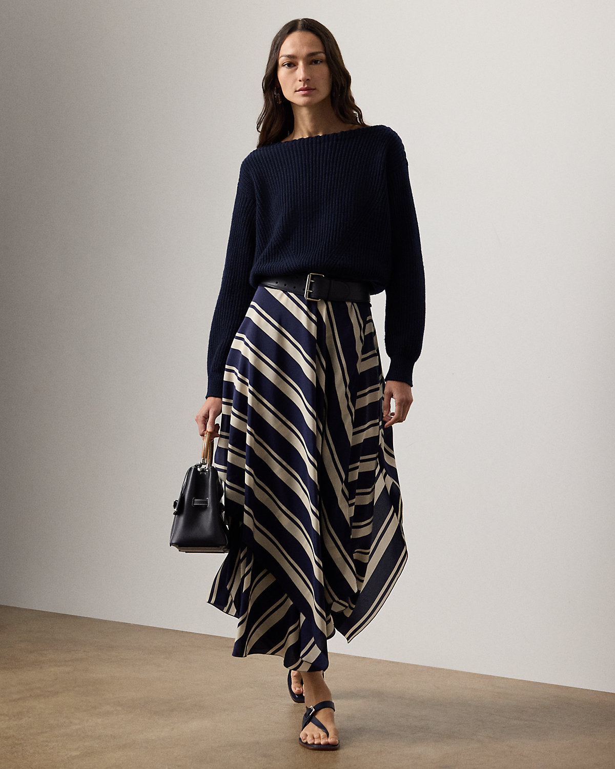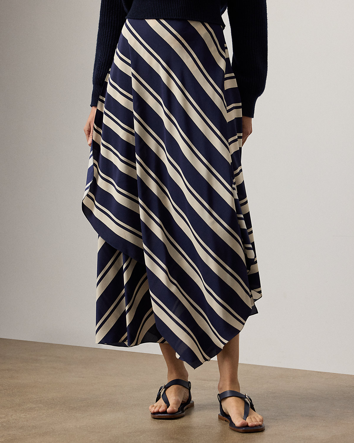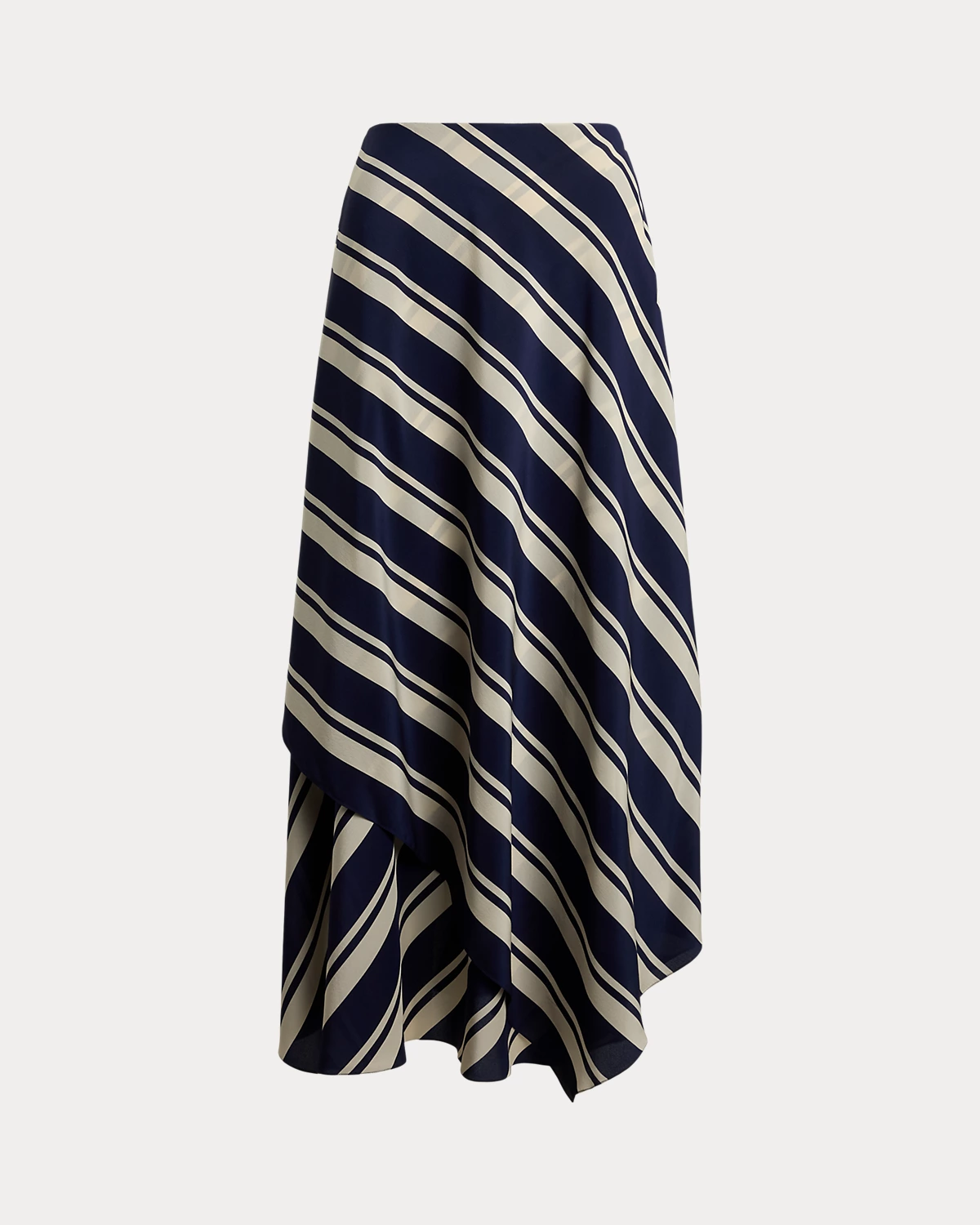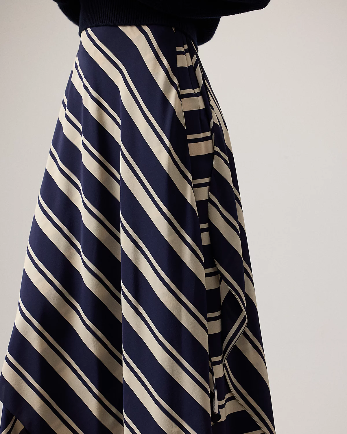 Designed with overlapping panels to form a cascading faux-wrap silhouette, the Tilda’s silk crepe de chine fabrication is printed with a nautical-inspired striped motif, which is carefully engineered to align with the layered panels for graphic intrigue. A handkerchief hem creates playful movement with each step.