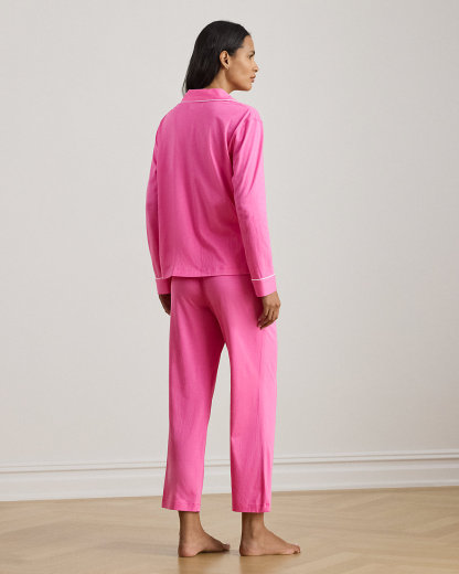 This sleep set pairs a menswear-inspired div-down shirt with comfortable drawcord ankle pants and a cotton-blend jersey fabrication. Lauren’s embroidered logo at the chest pocket and contrast piping add refined finishing touches.