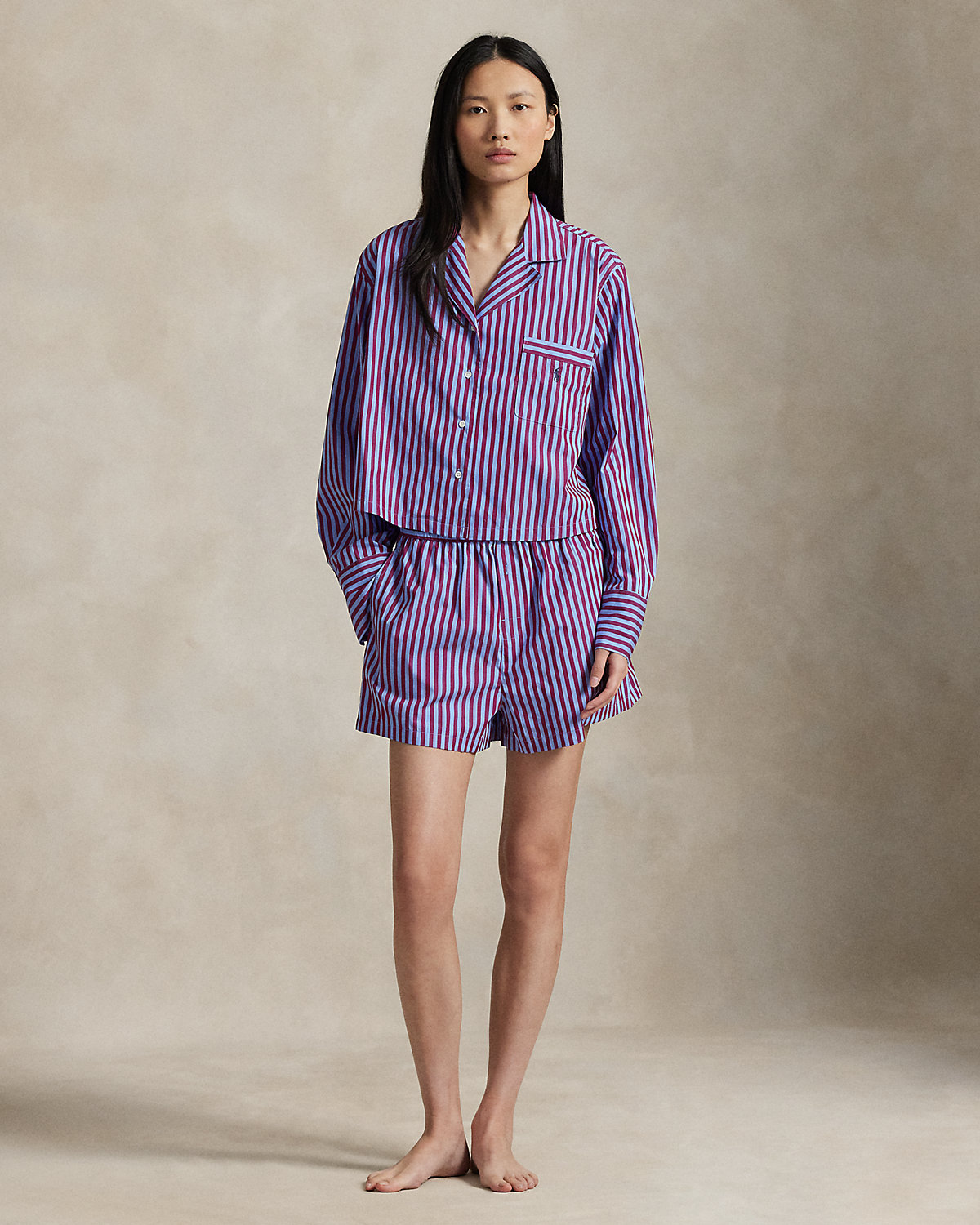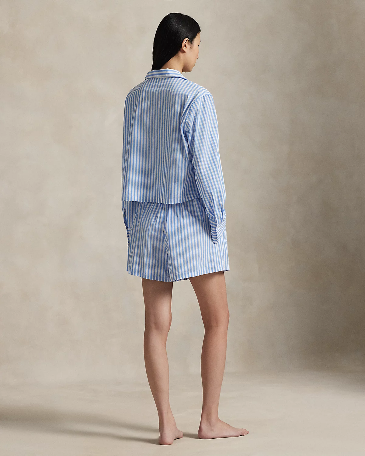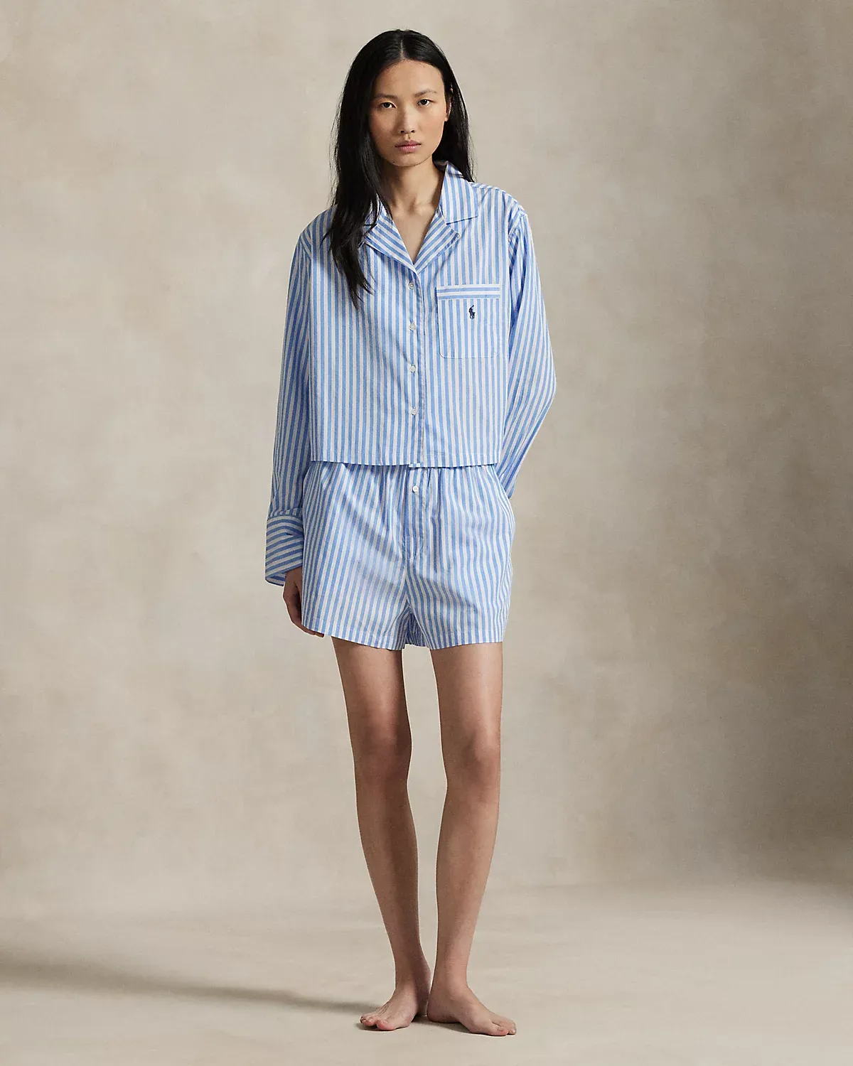 Crafted with crisp cotton poplin, this striped two-piece pajama set comes with a cropped shirt and high-waisted boxer shorts. Ralpthth Lauren partners with Better Cotton™ to improve cotton farming globally. Better Cotton trains farmers to use water efficiently, care for the health of the soil and natural habitats, reduce use of the most harmful chemicals, and implement the principles of decent work.