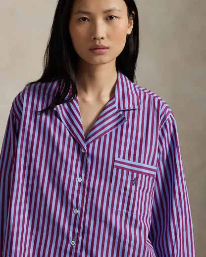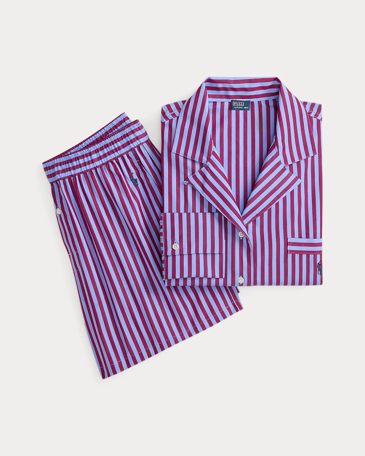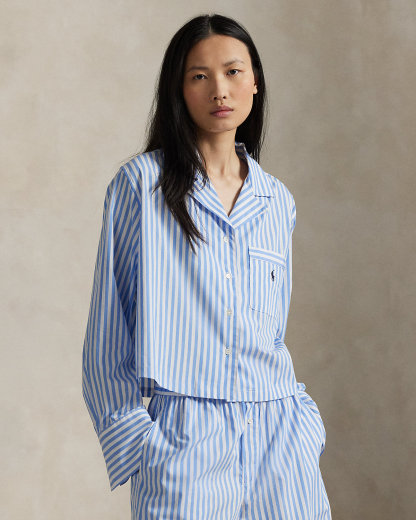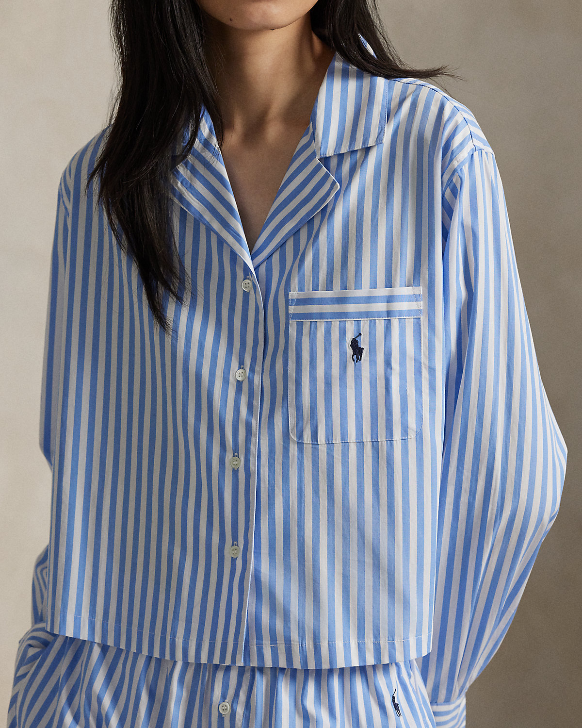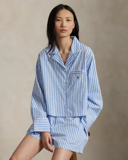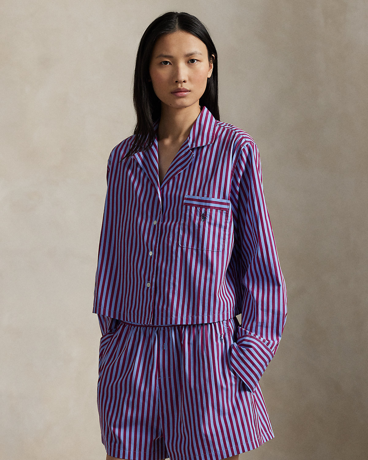 Crafted with crisp cotton poplin, this striped two-piece pajama set comes with a cropped shirt and high-waisted boxer shorts. Ralpthth Lauren partners with Better Cotton™ to improve cotton farming globally. Better Cotton trains farmers to use water efficiently, care for the health of the soil and natural habitats, reduce use of the most harmful chemicals, and implement the principles of decent work.