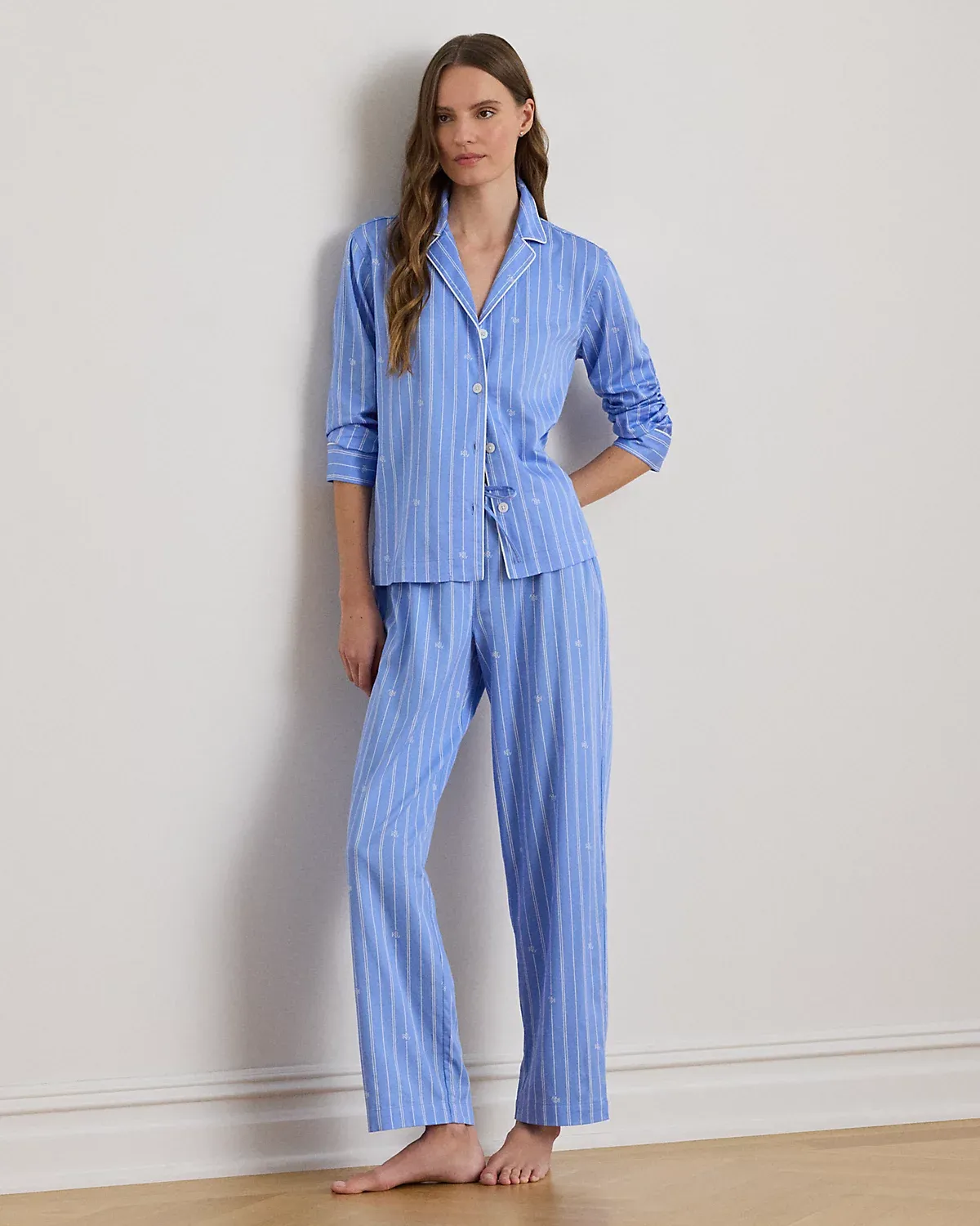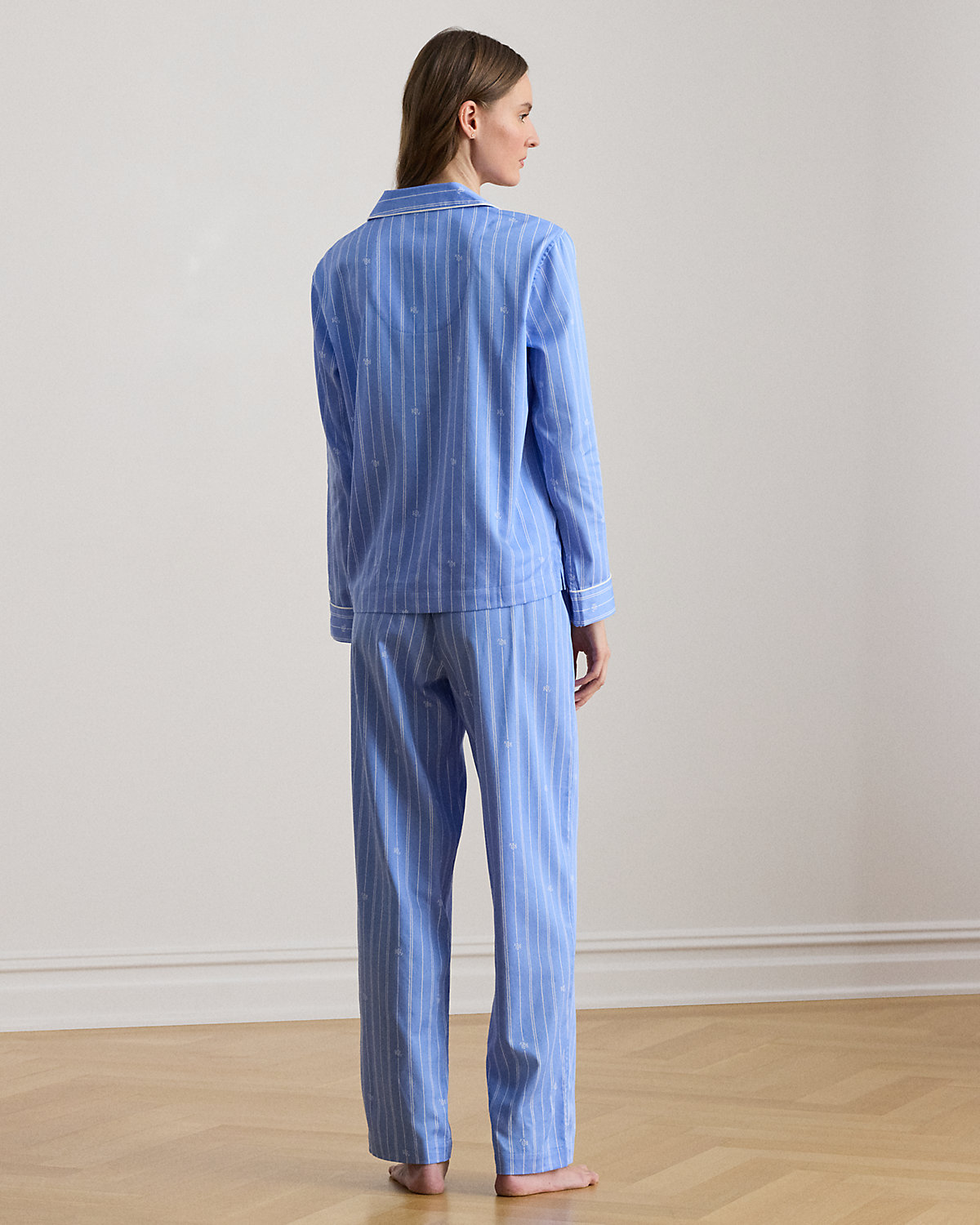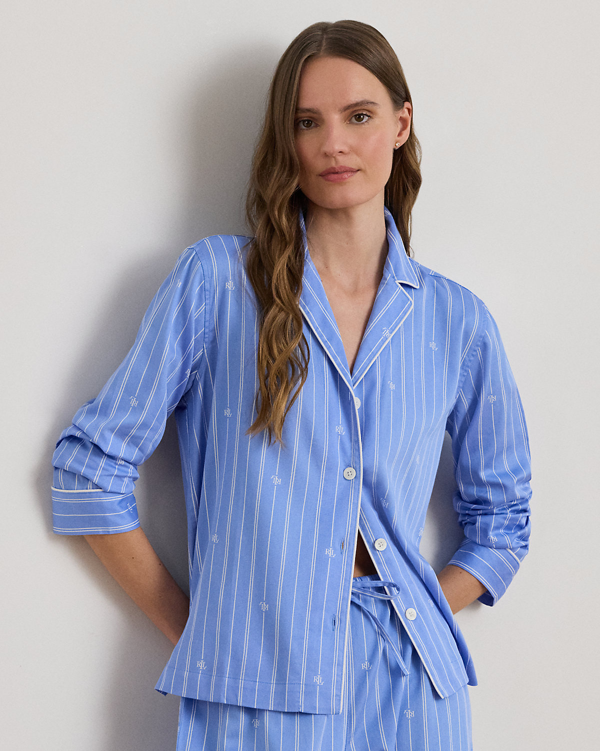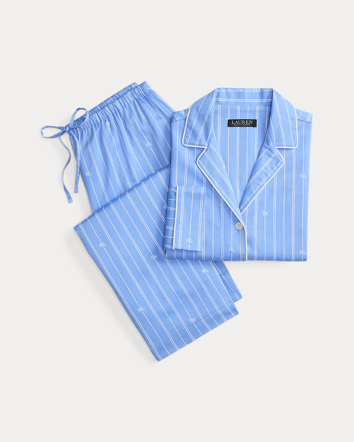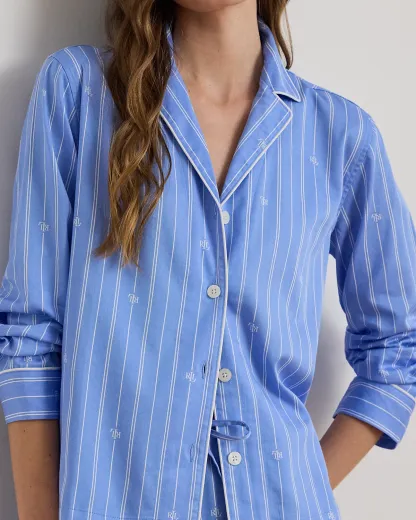 Smooth cotton-blend sateen brings a fluid drape to this sleep set, which includes a notch-collar shirt and drawcord pants. This version displays a classic striped pattern accented by our signature logo.
