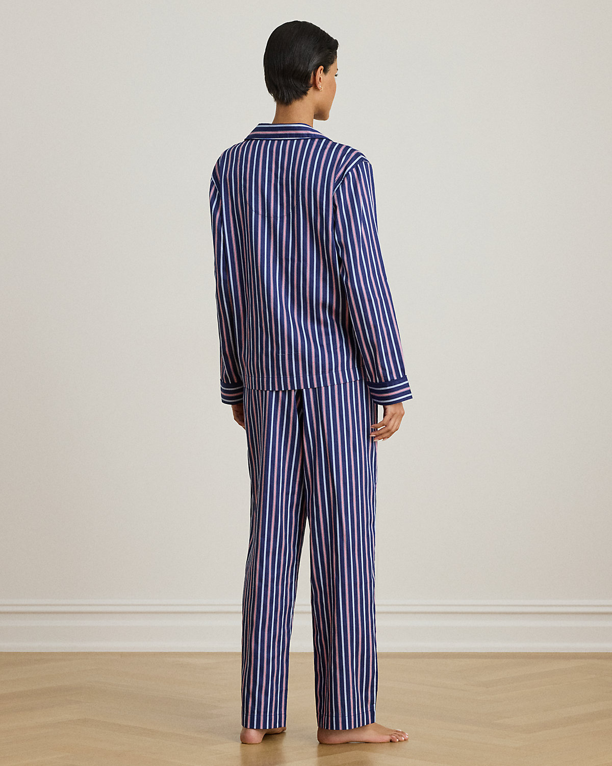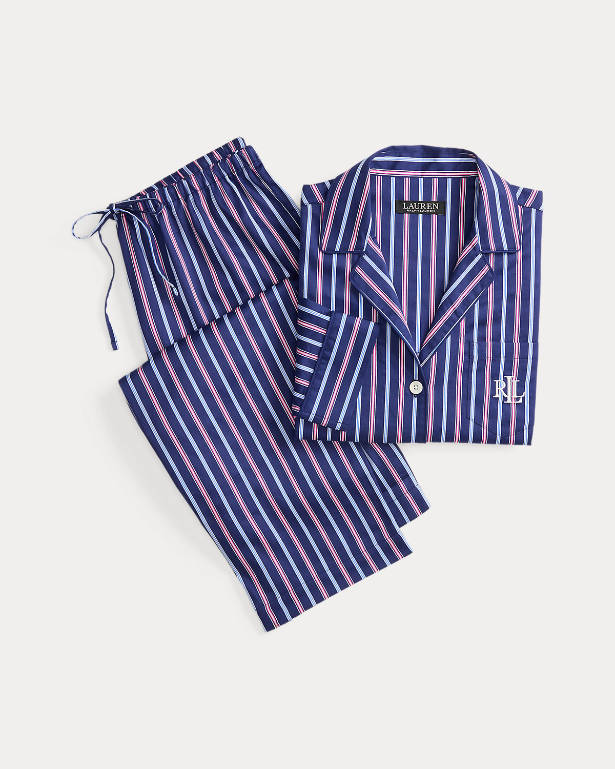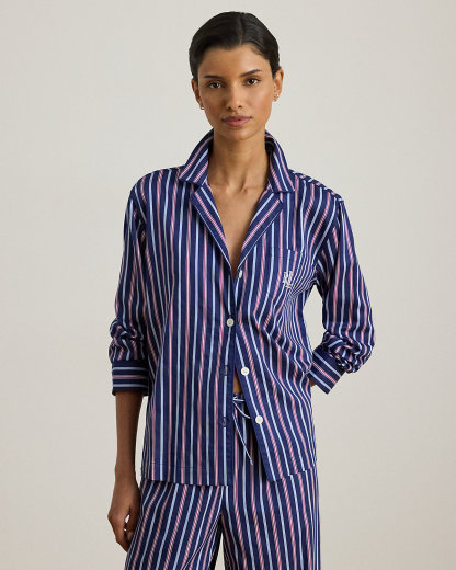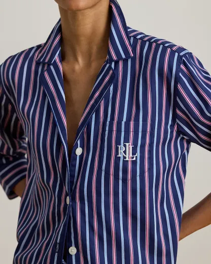 Tailored from smooth sateen for a subtle sheen, this striped sleep set pairs a notch collar shirt with comfortable drawcord pants. Lauren’s signature logo at the chest pocket completes the look.