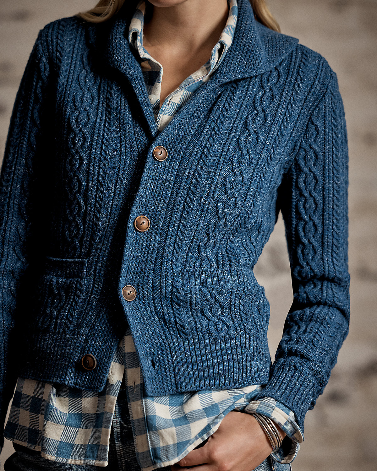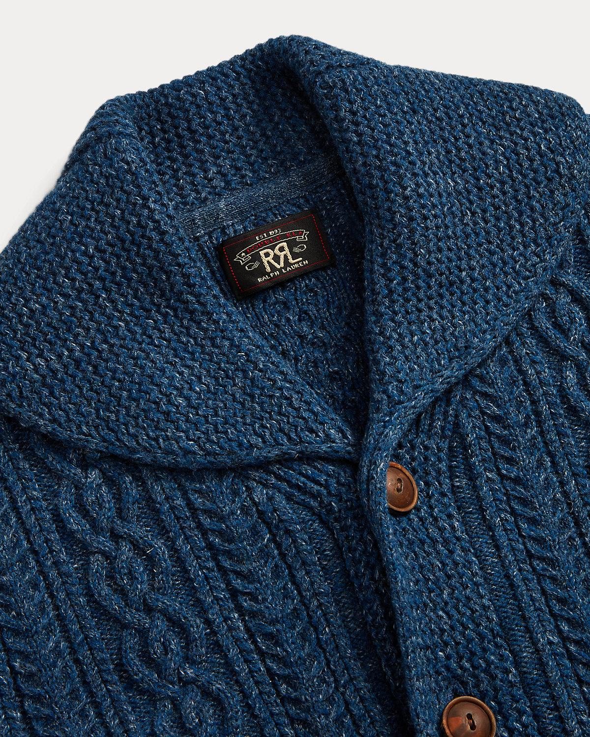 Cable-knit cardigan made with cotton and semi-worsted wool. Designed with a shawl collar and accented with waist patch pockets. Finished with genuine horn divs.