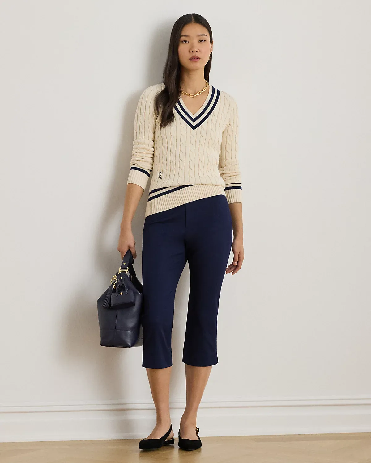 Detailed with stripes along the neckline, cuffs, and hem, this version of Lauren’s iconic cricket sweater features a cable-knit combed cotton construction and an embroidered logo at the hem.