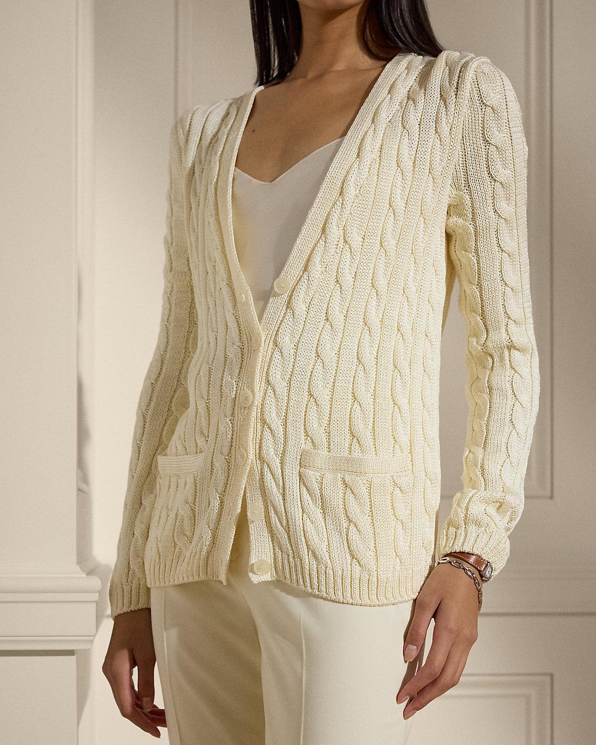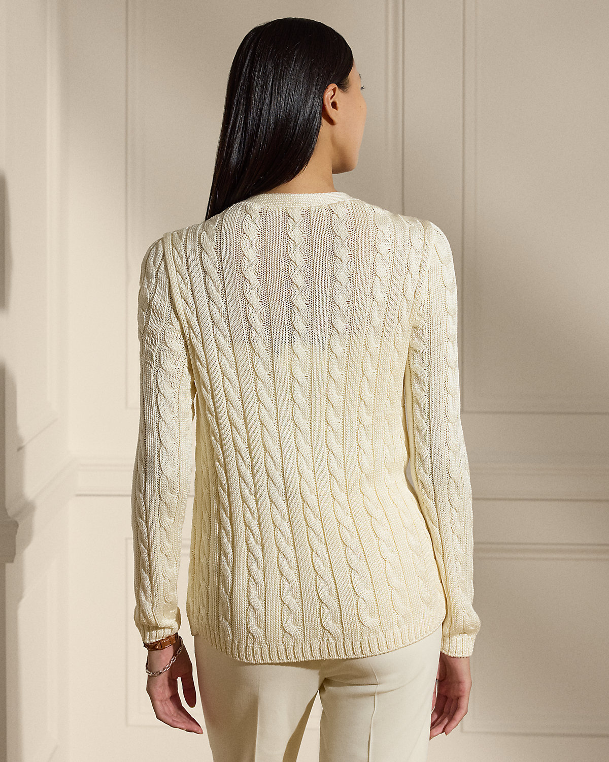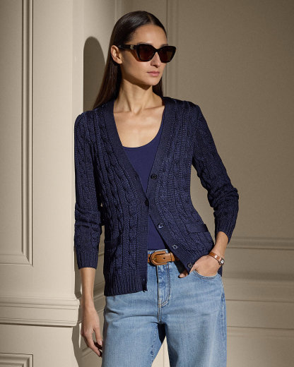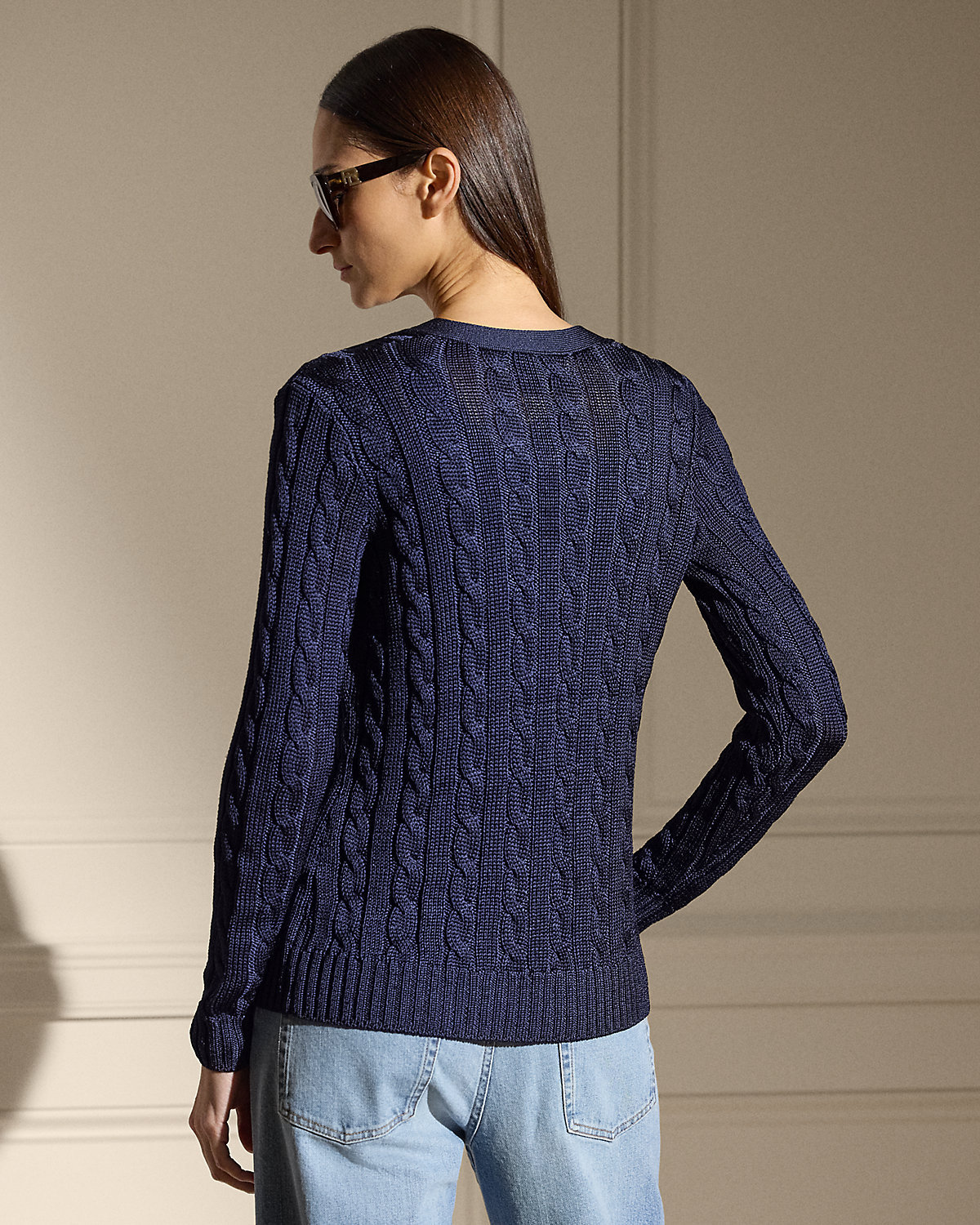 Our iconic cable-knit cardigan sweater melds impeccable craftsmanship with the refined luxury of high-shine tussah silk, which is specially selected for its soft hand feel and beautiful sheen.