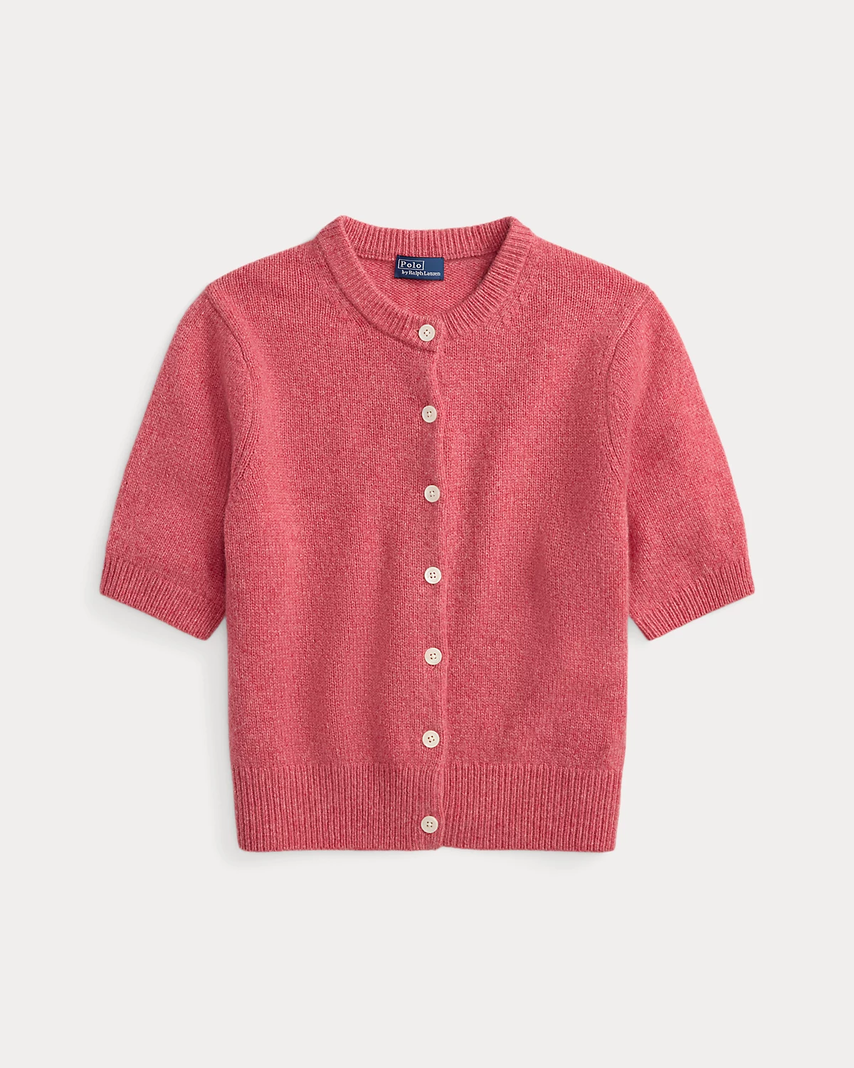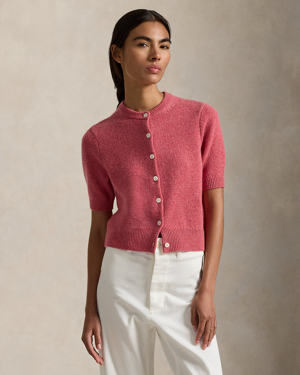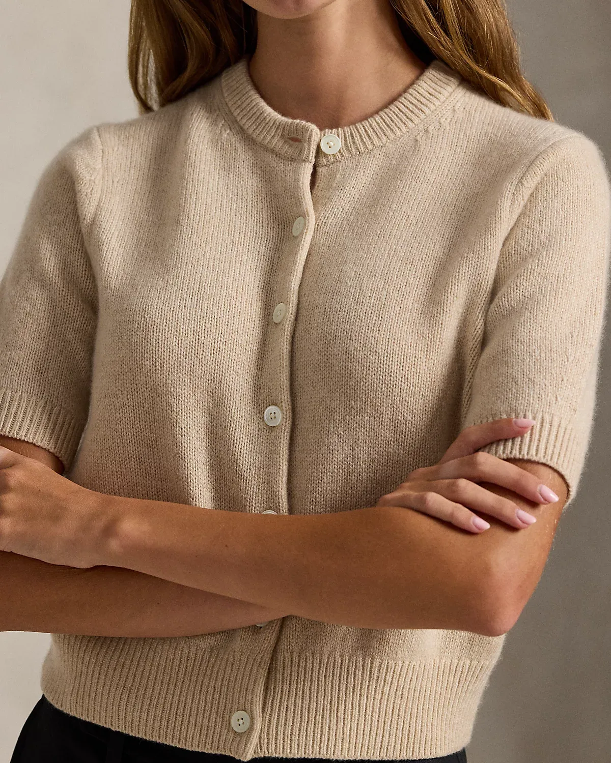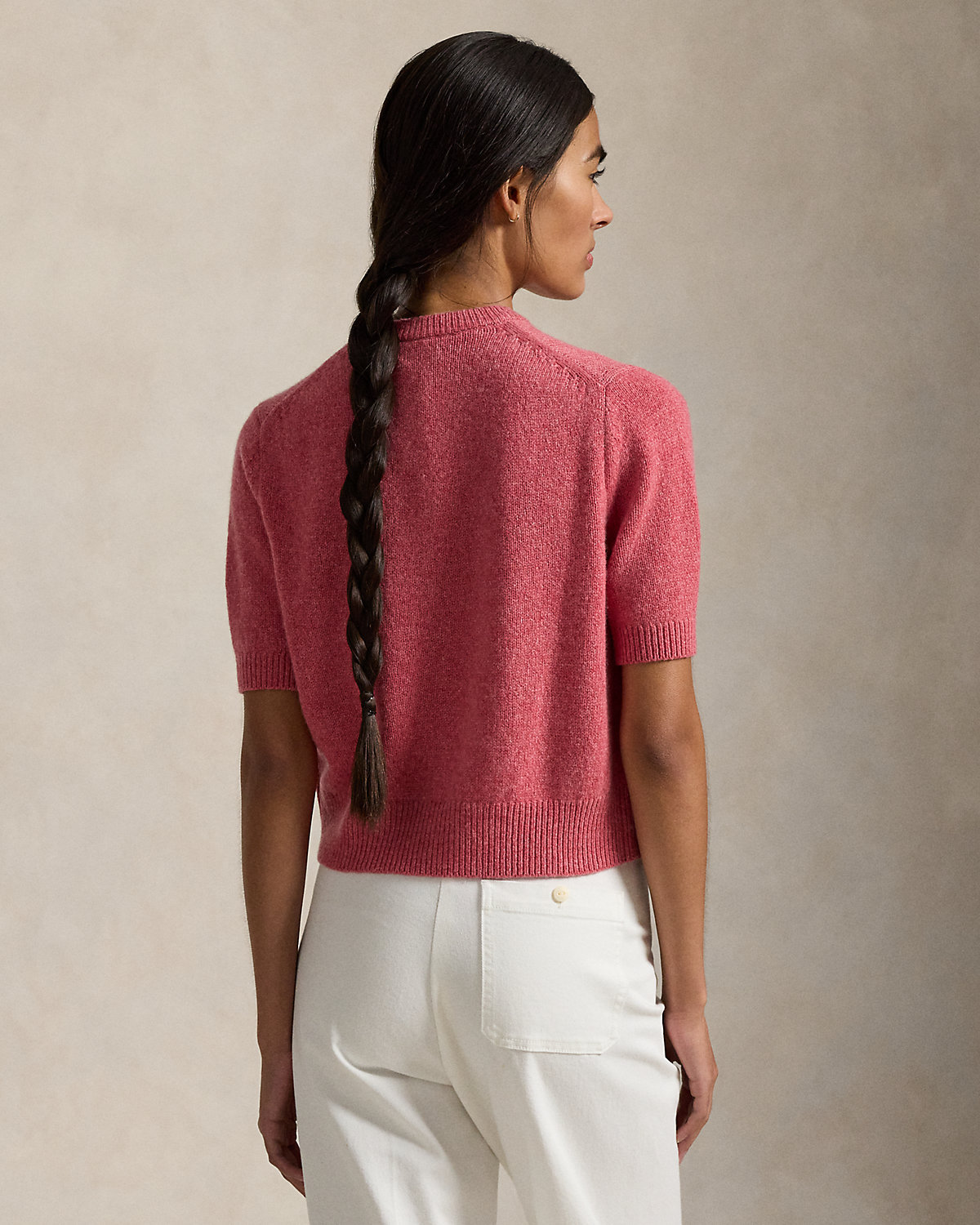 Luxuriously crafted with fiber-dyed cashmere in a woolen spinning construction, this short-sleeve cardigan features a delicate surface texture with subtle loft.