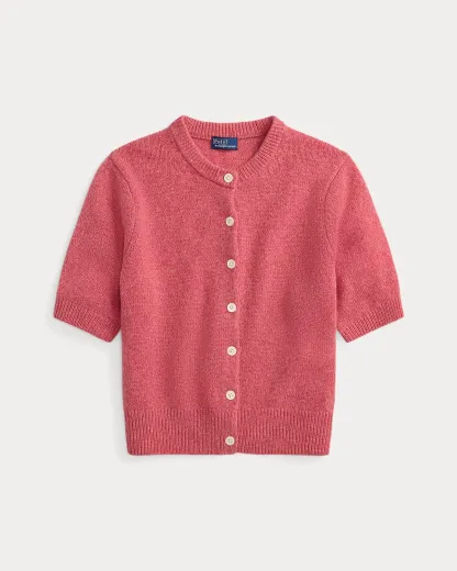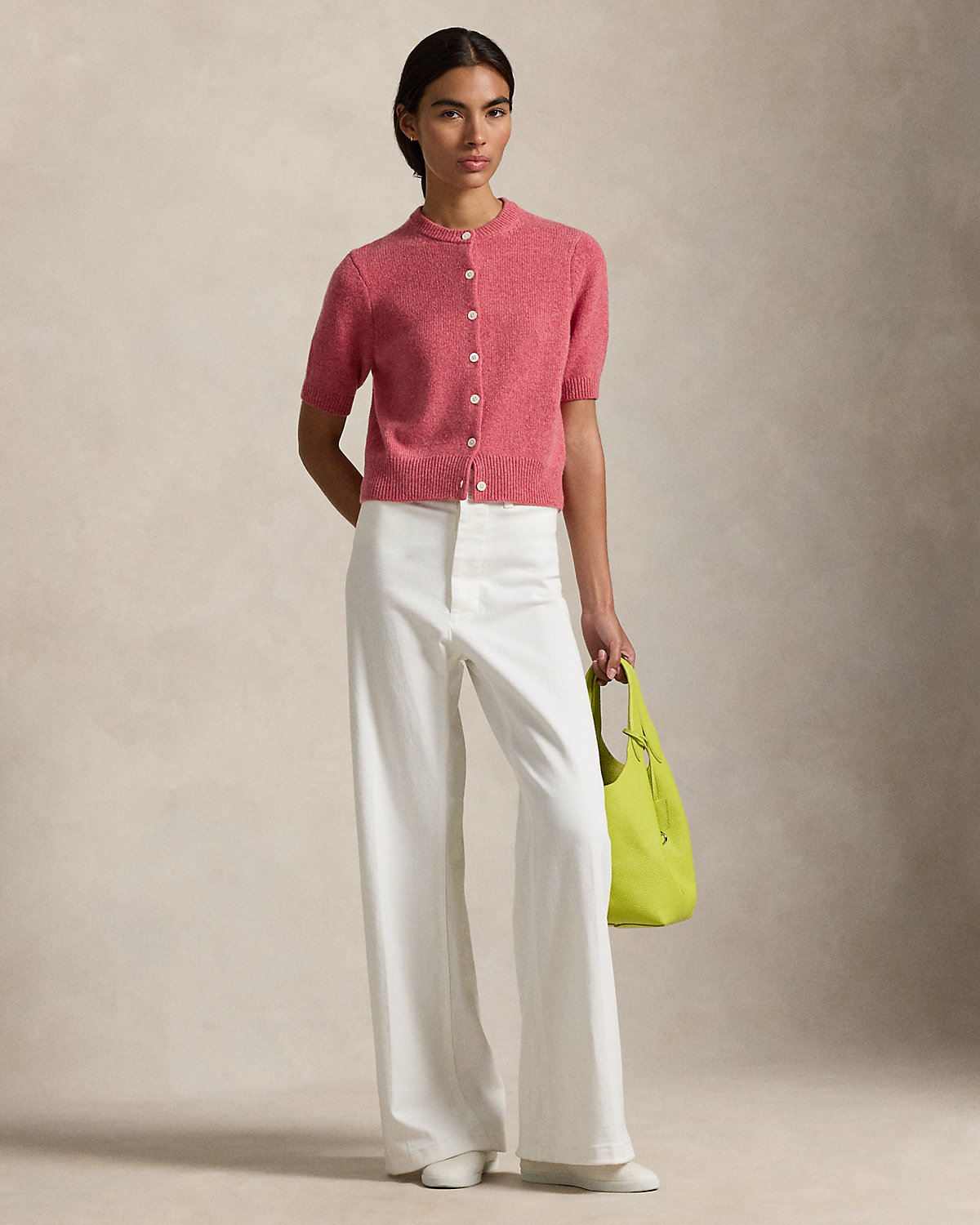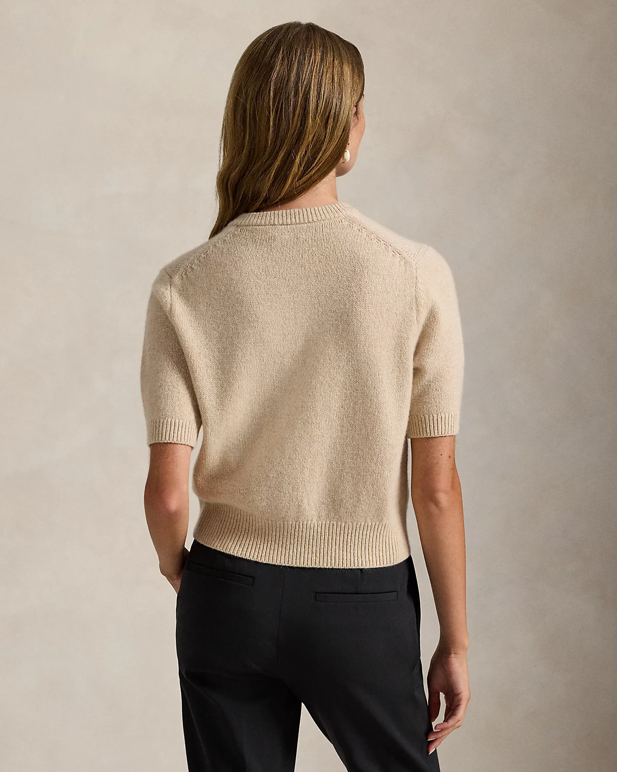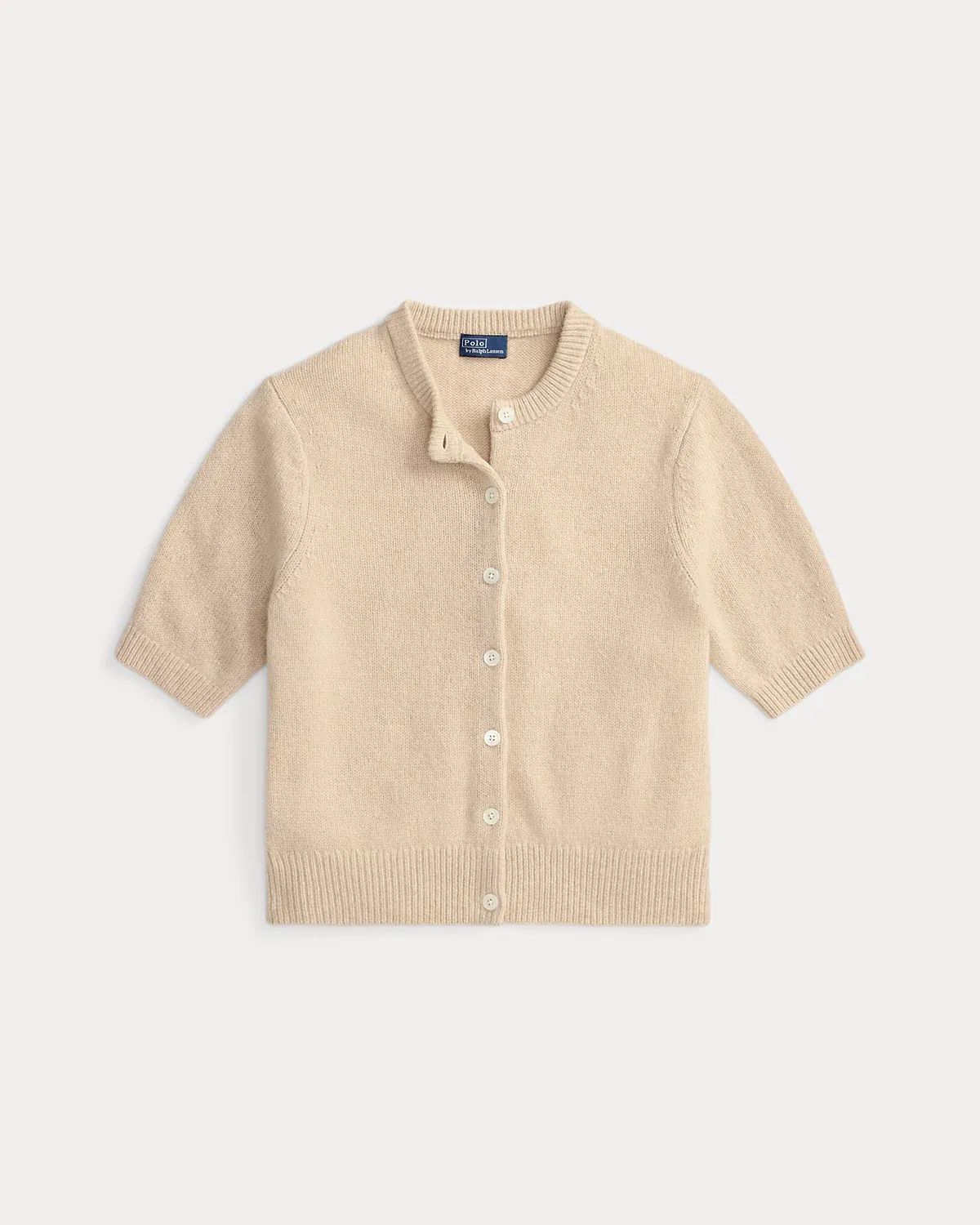 Luxuriously crafted with fiber-dyed cashmere in a woolen spinning construction, this short-sleeve cardigan features a delicate surface texture with subtle loft.