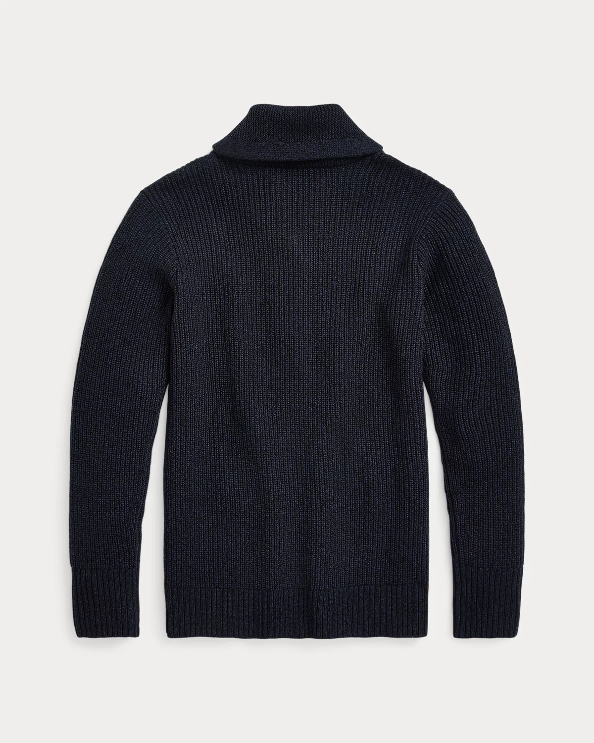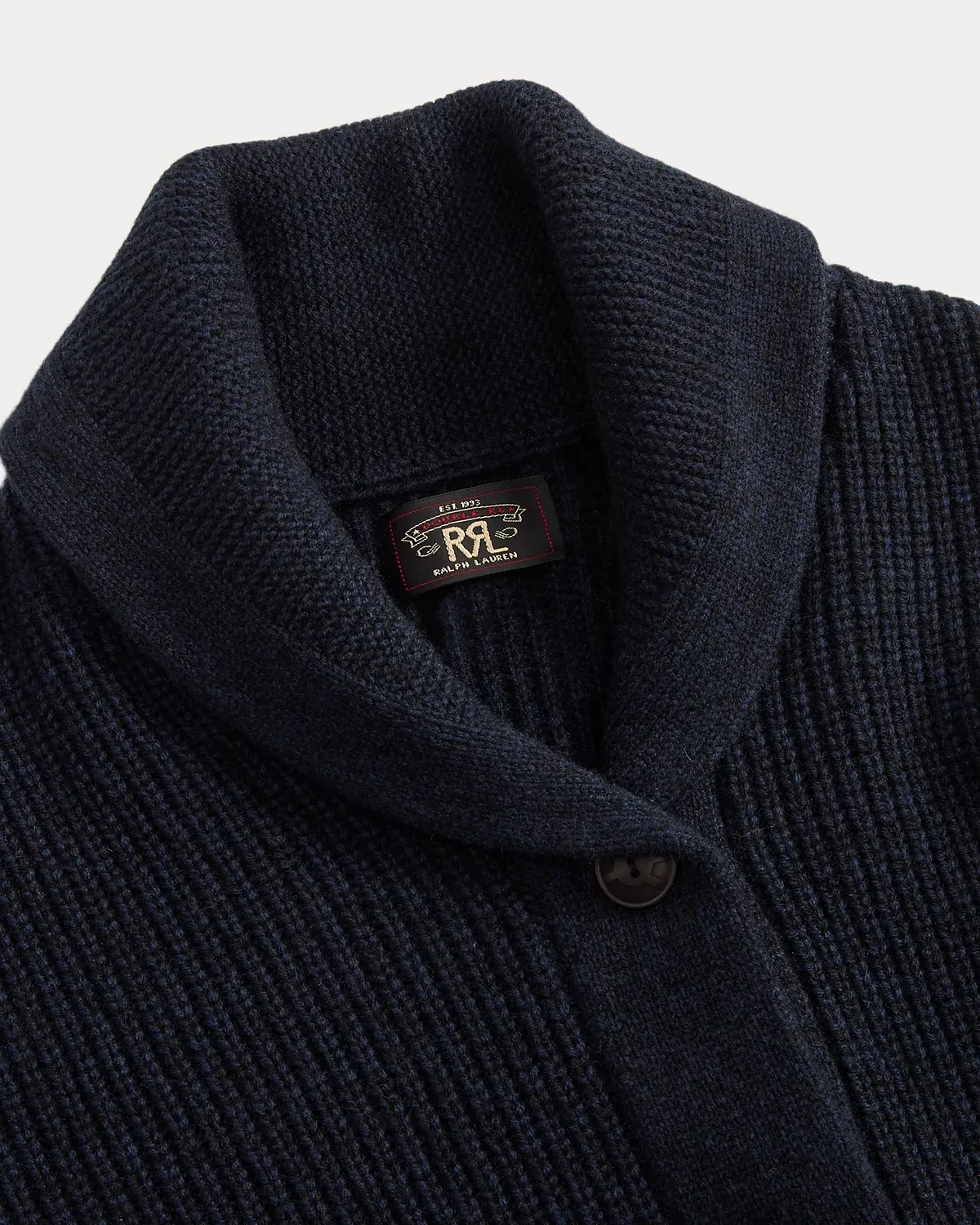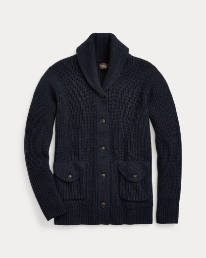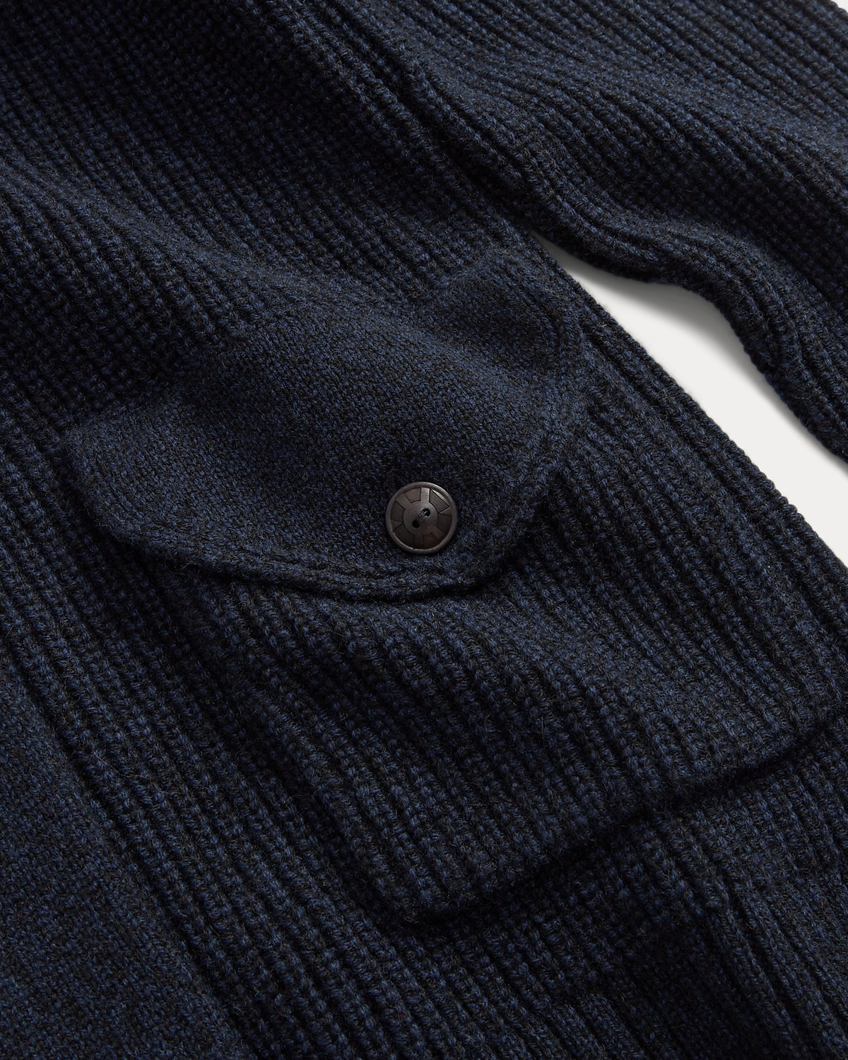 Shawl-collar cardigan made with luxurious, medium-weight cashmere. Black and navy yarns are pre-twisted together to create dimensional color and texture. Vintage-inspired garter stitching at the collar and pockets. Buttoned-flap patch pockets at the waist. Corozo divs.