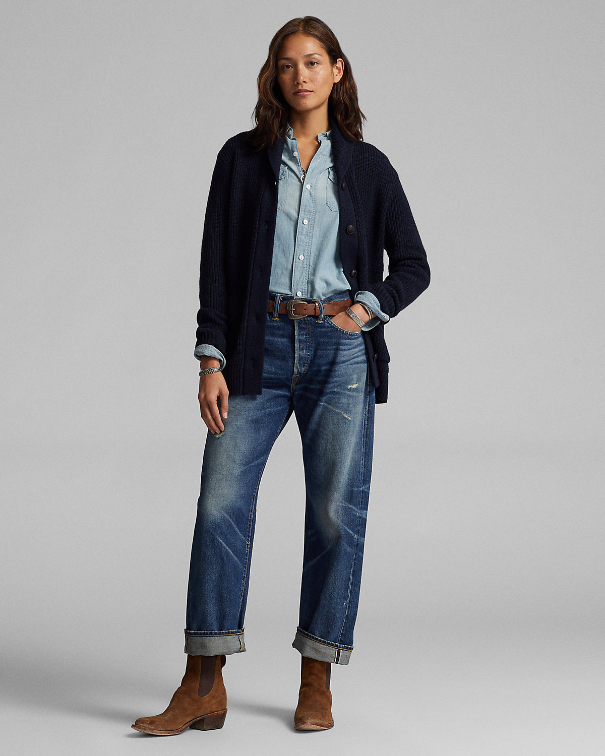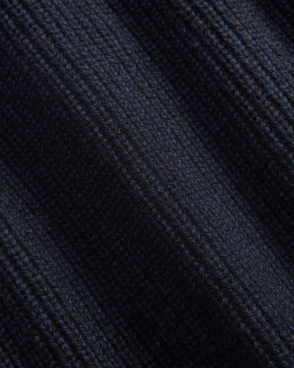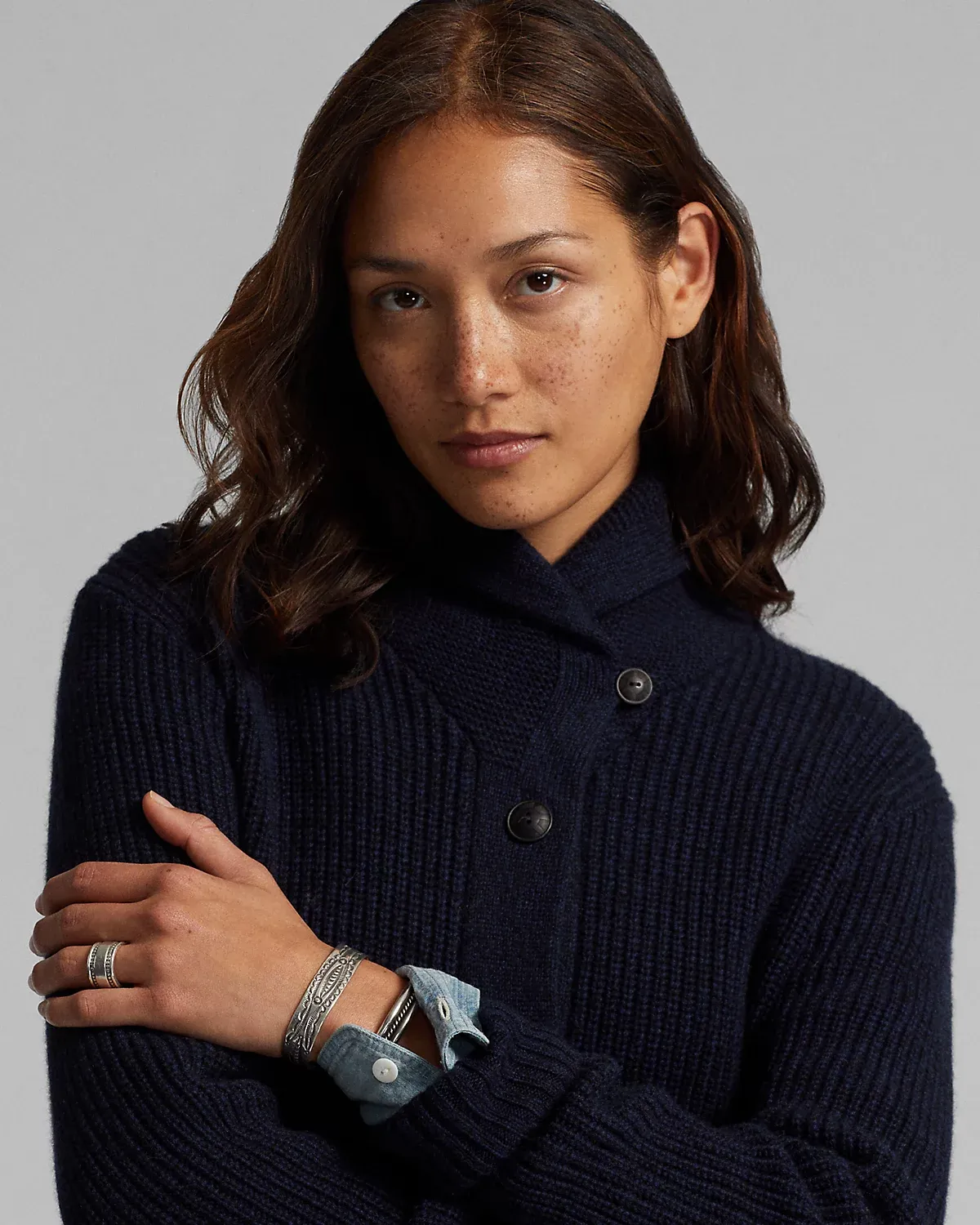 Shawl-collar cardigan made with luxurious, medium-weight cashmere. Black and navy yarns are pre-twisted together to create dimensional color and texture. Vintage-inspired garter stitching at the collar and pockets. Buttoned-flap patch pockets at the waist. Corozo divs.