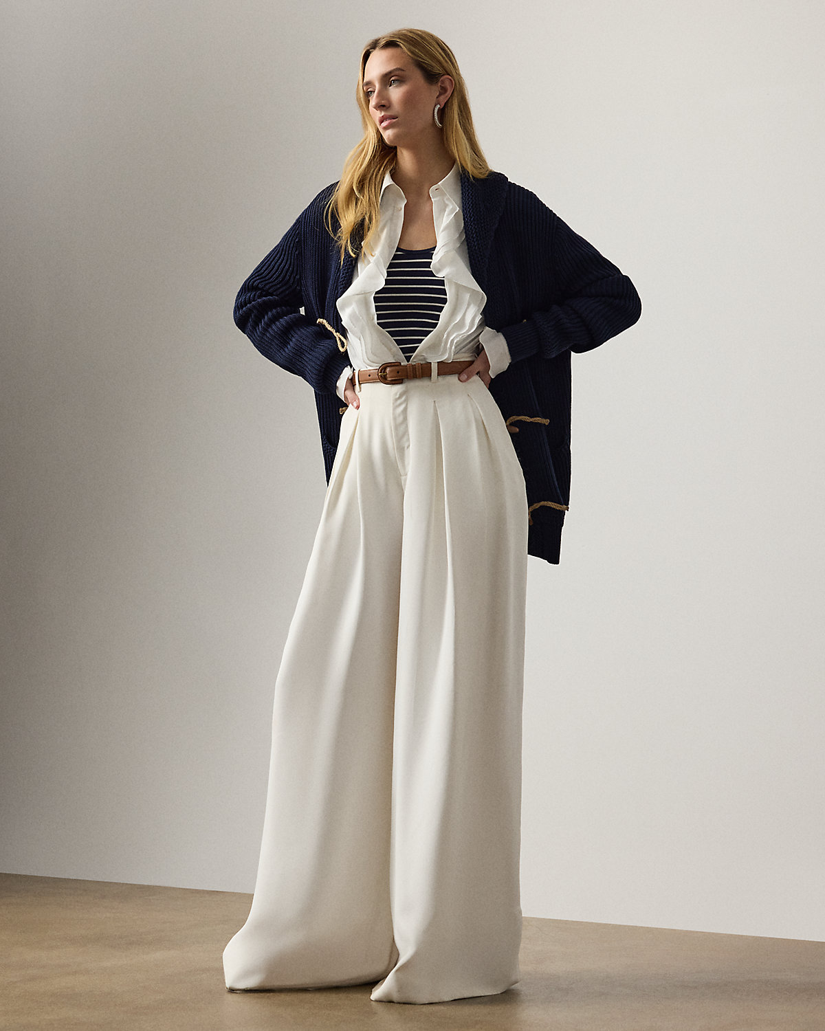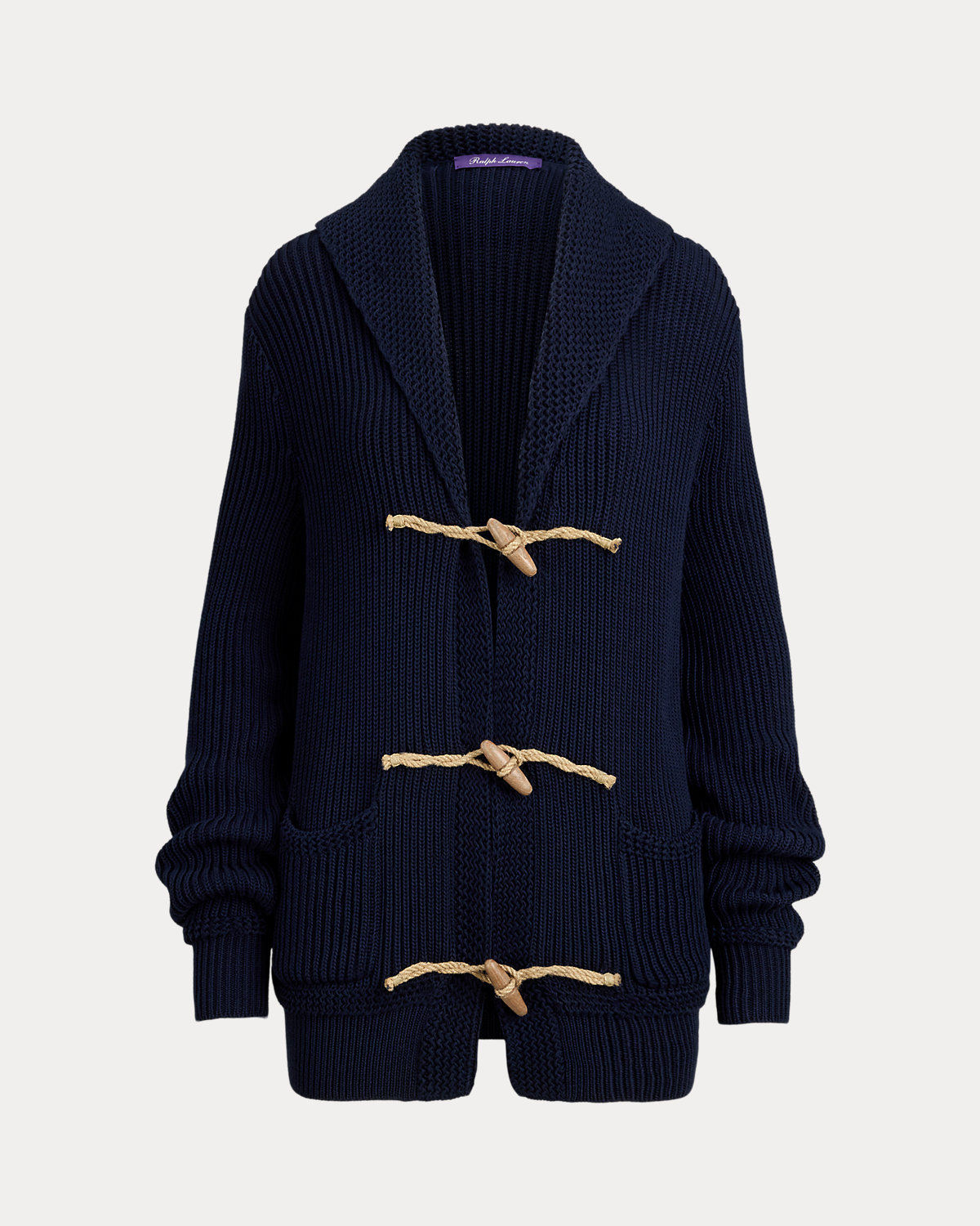 Combining Mr. Lauren’s commitment to fine Italian craftsmanship with the season’s nautical-inspired aesthetic, this updated version of our signature shawl-collar cardigan features a traditional cardigan stitch, racking stitch detailing, and a toggle-and-loop closure composed of handmade wooden toggles and jute loops. Cut for a relaxed, thigh-grazing fit, this sweater is made with a luxurious blend of ultrasoft cotton and brilliant silk, creating a precious, breathable fabric ideal for the warmer months.