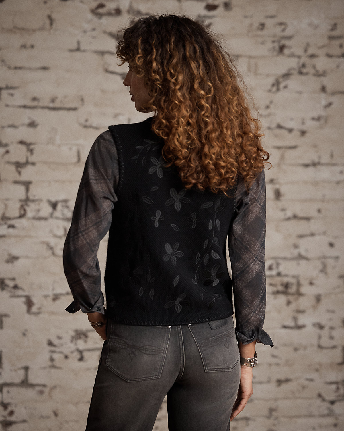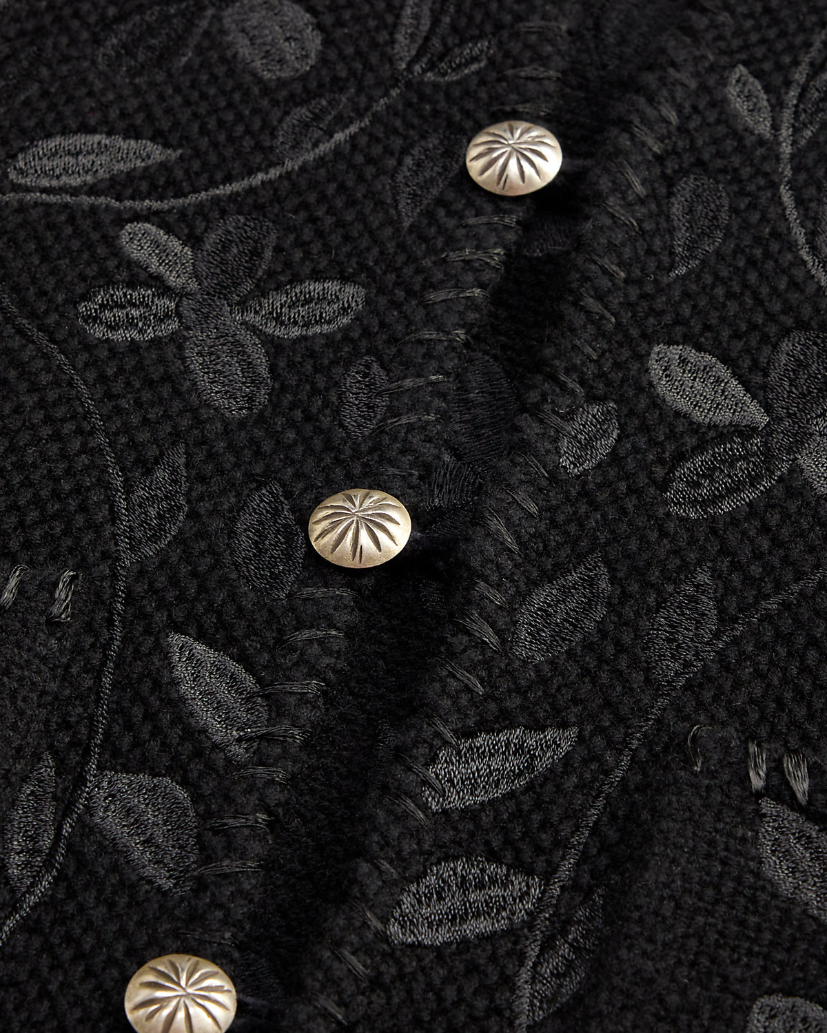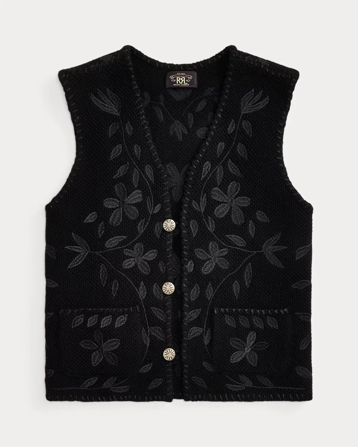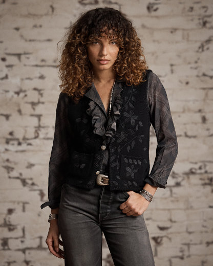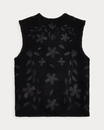 Made from wool-and-cashmere yarns. Inspired by a vest from the 1920s. Knit using a seed-stitched technique. Floral satin-stitched embroidery and hand-applied whipstitched details throughout. Metal divs.