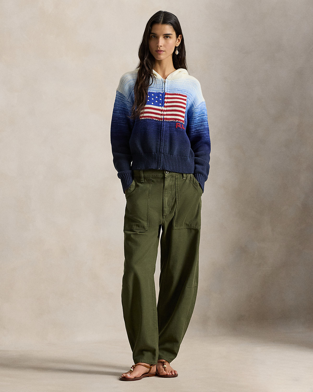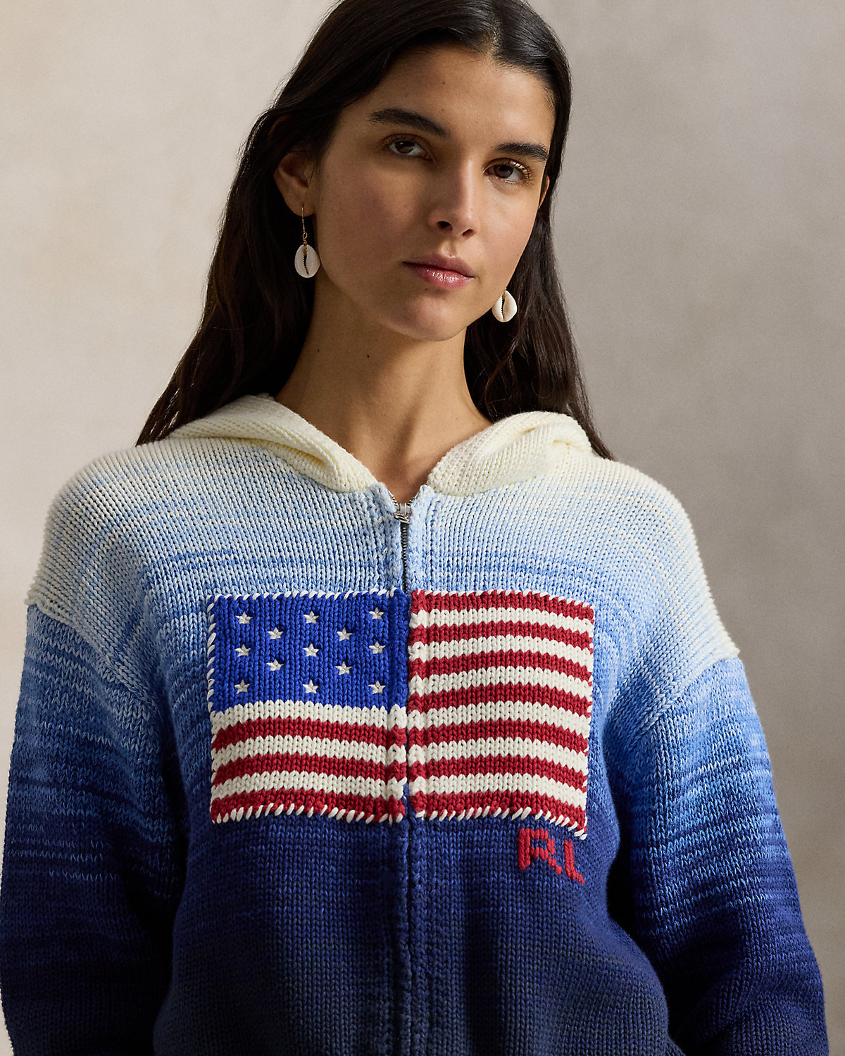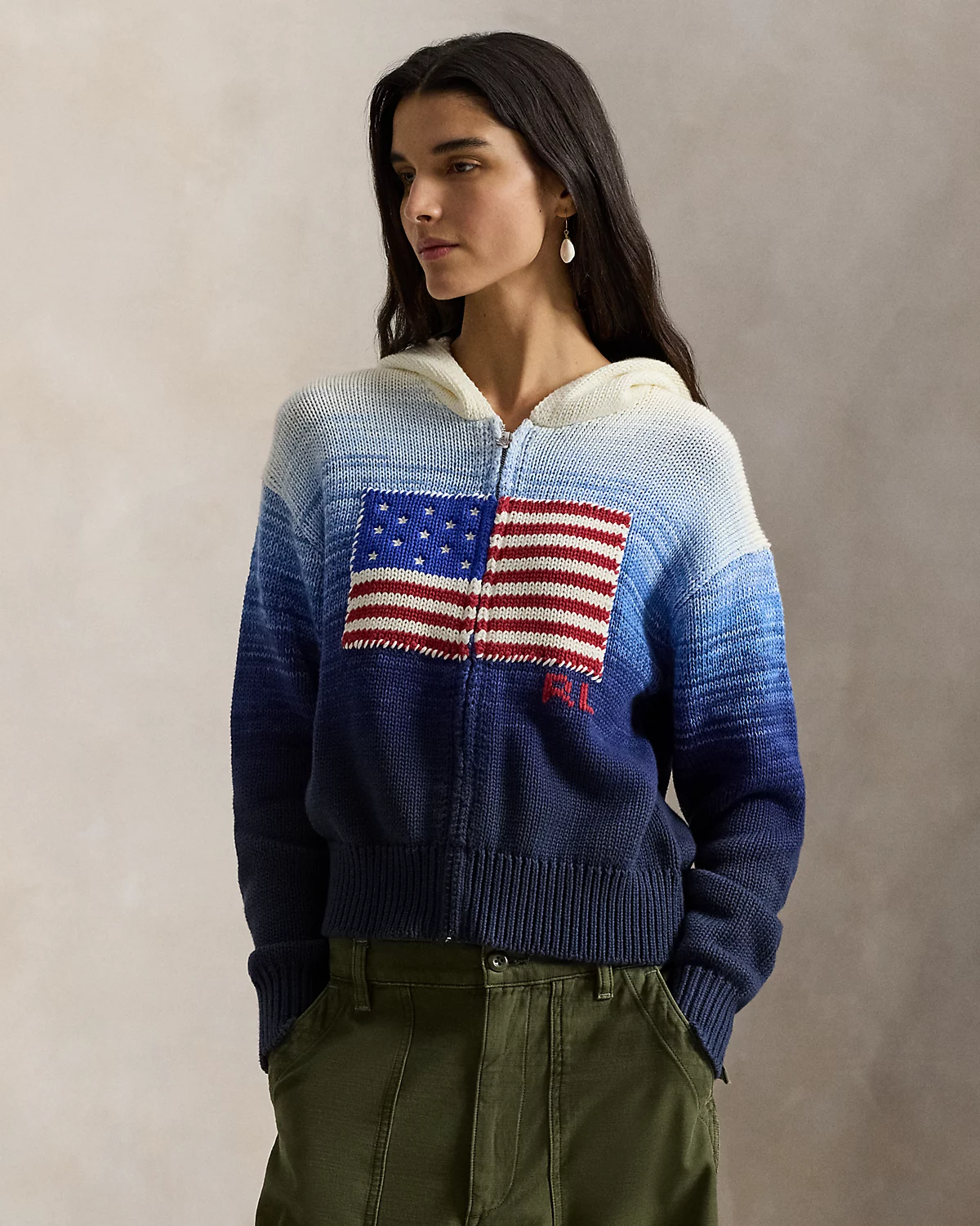 Specially knit with cotton for an ombré effect, this version of Polo’s iconic flag sweater features a full-zip placket and hood. Embroidered stars, whipstitching, and a hand-embroidered “RL” logo add texture and dimension to the relaxed-fitting silhouette.