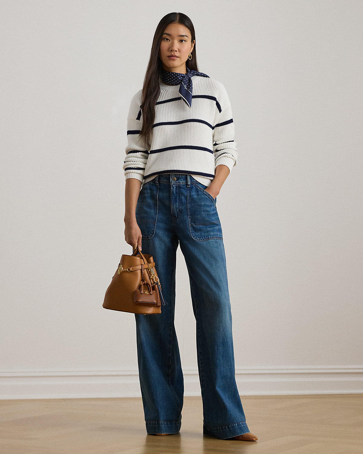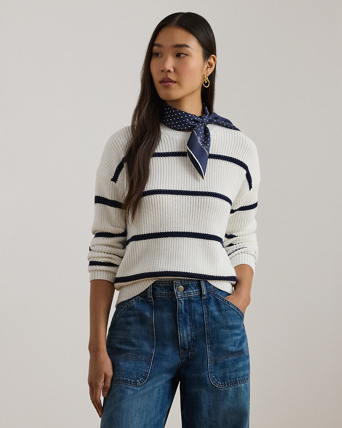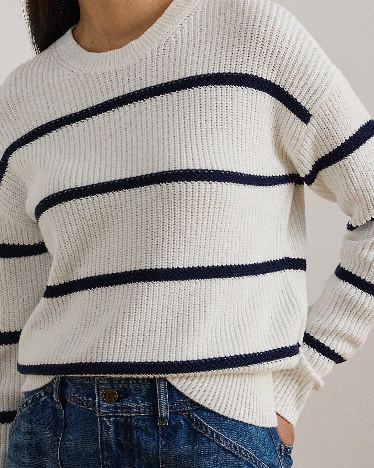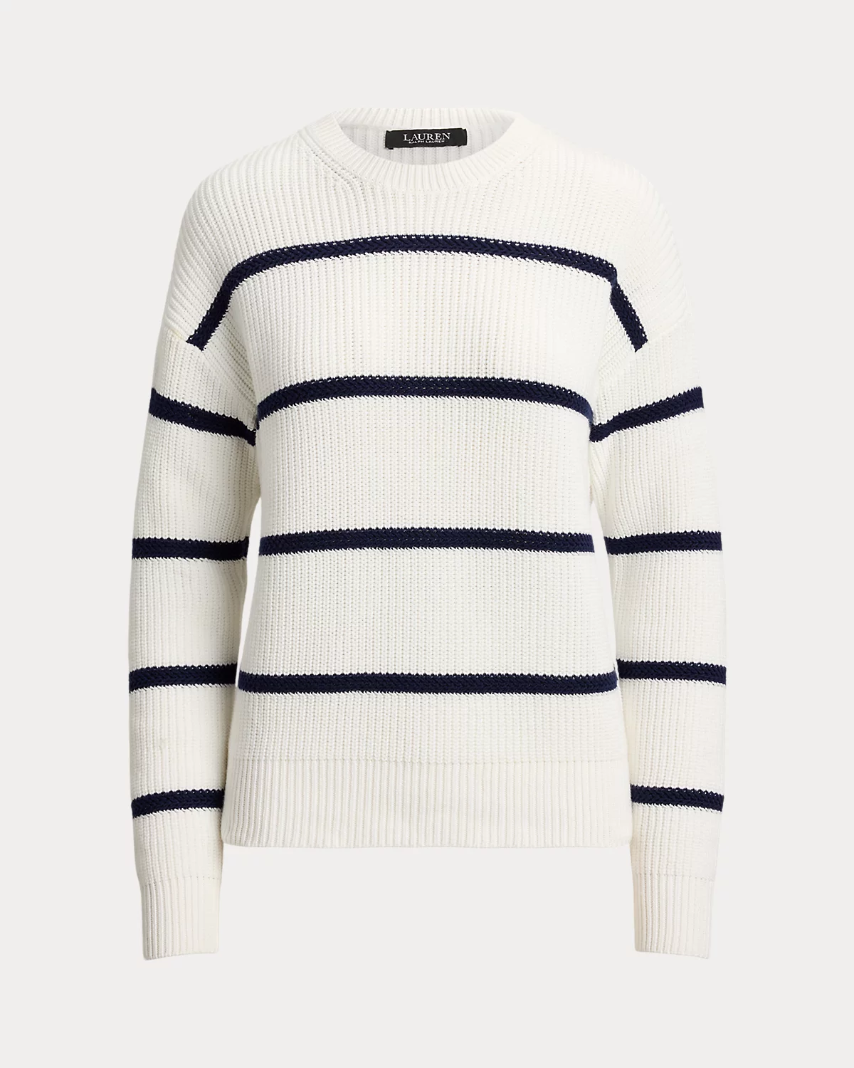 A relaxed silhouette, dropped shoulders, and a combed cotton fabrication lend to the cozy feel of this striped crewneck sweater, which is rib-knit for subtle dimension.