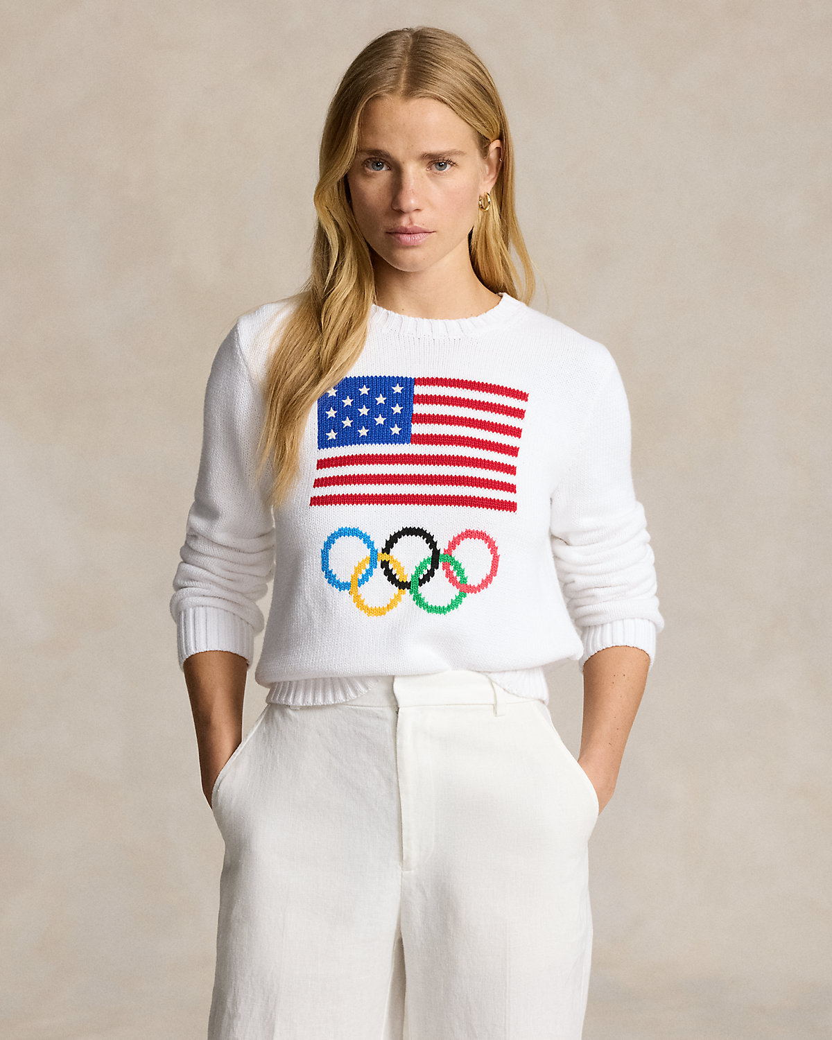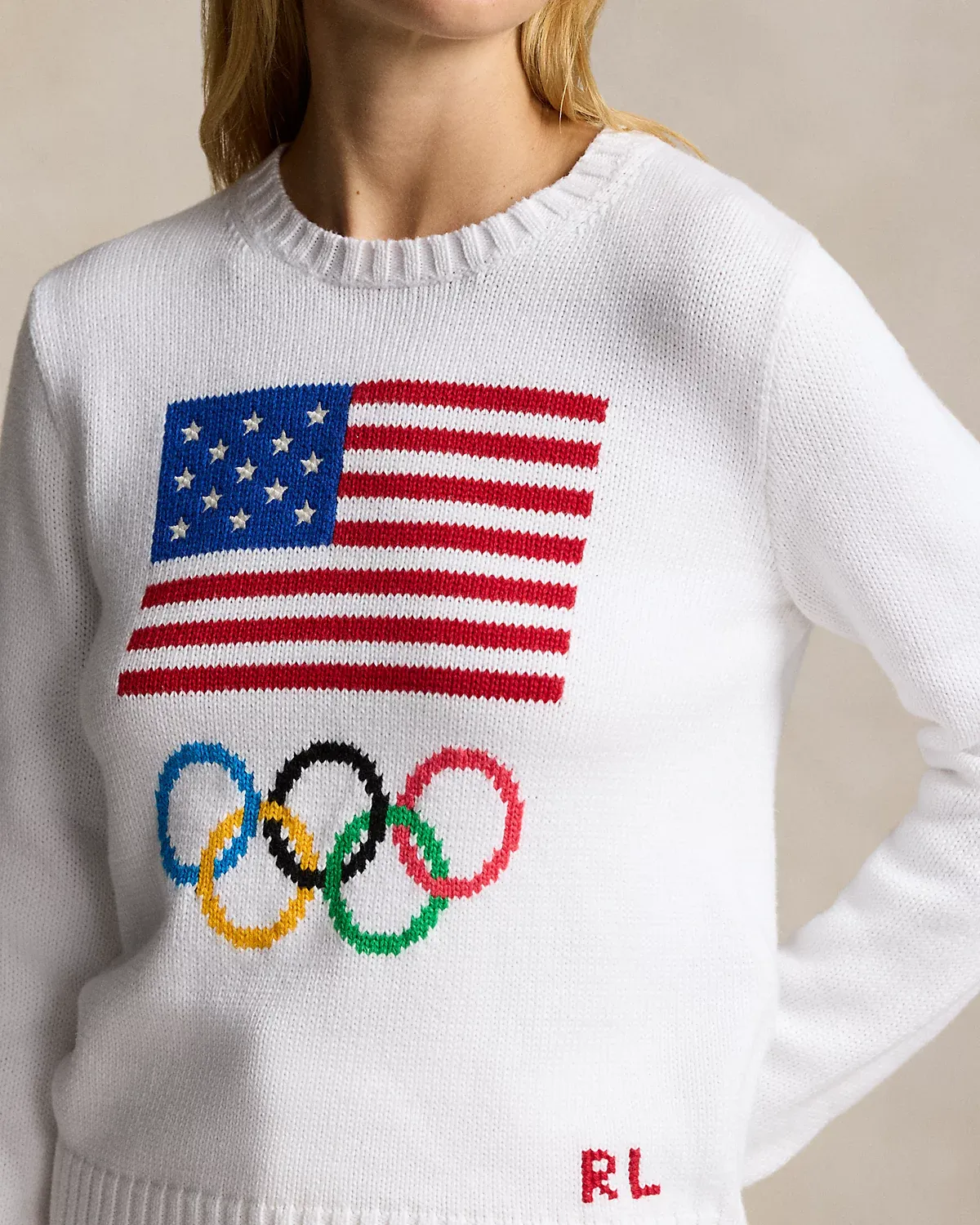 - Intarsia-knit historical American flag and the Olympic Rings at the center front. Embroidered stars. “RL” hand-embroidered above the left hem.