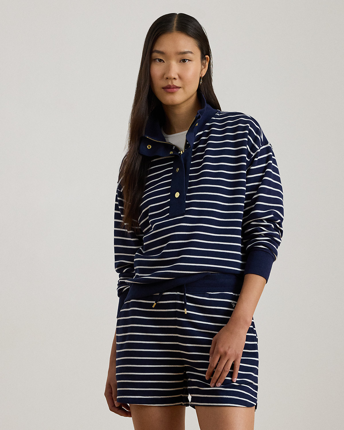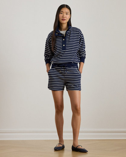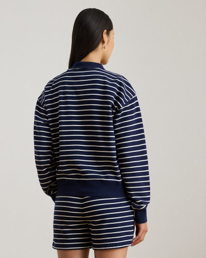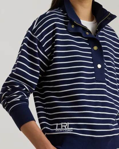 This mockneck half-zip sweatshirt balances the comfort of cotton-blend French terry with classic navy-and-white stripes and Lauren’s signature embroidered logo at the hem.