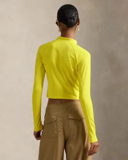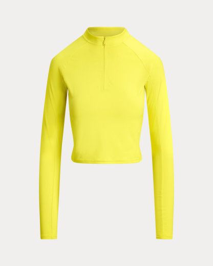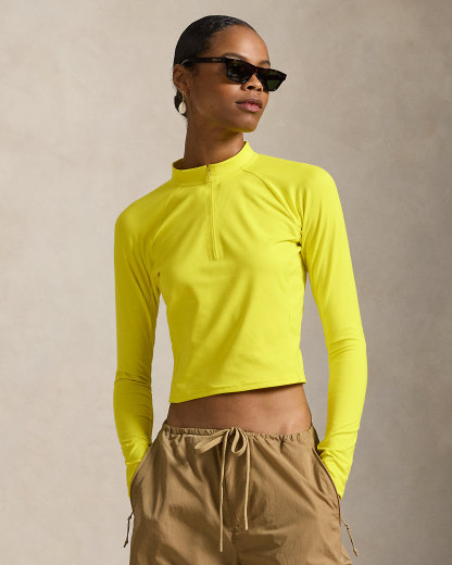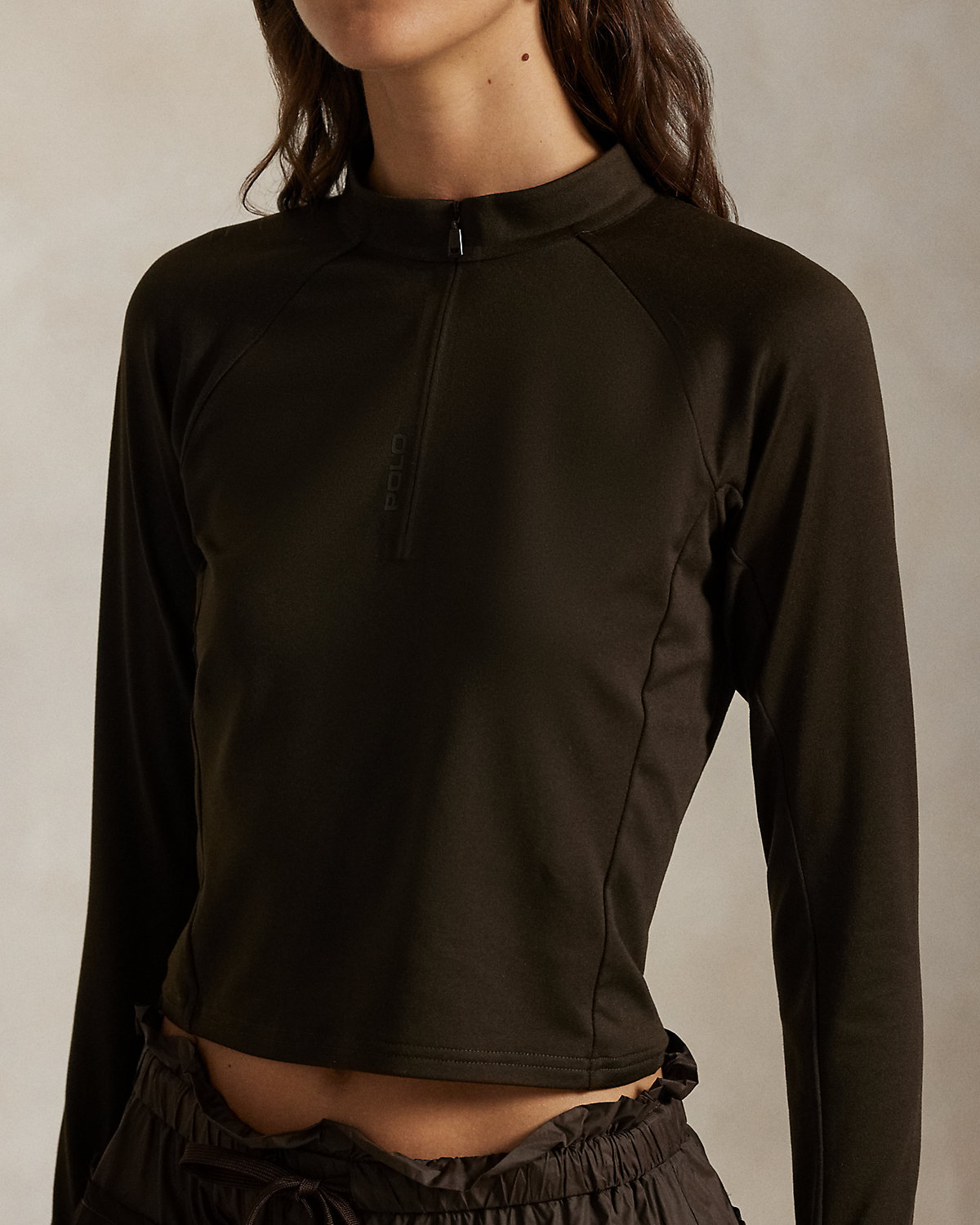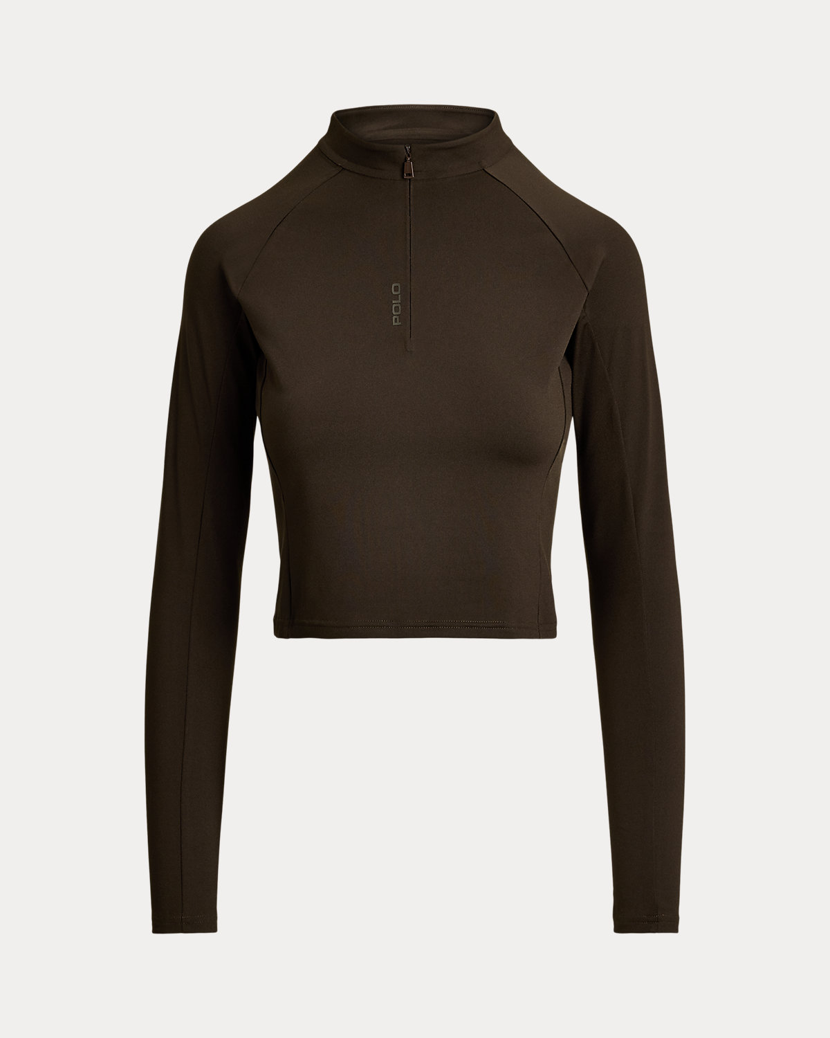 Crafted with stretch-blend sueded jersey for a velvety smooth hand, this half-zip mockneck pullover combines long raglan sleeves with a cropped, slim silhouette. Our rubber-printed “Polo” logo adds a signature finish.