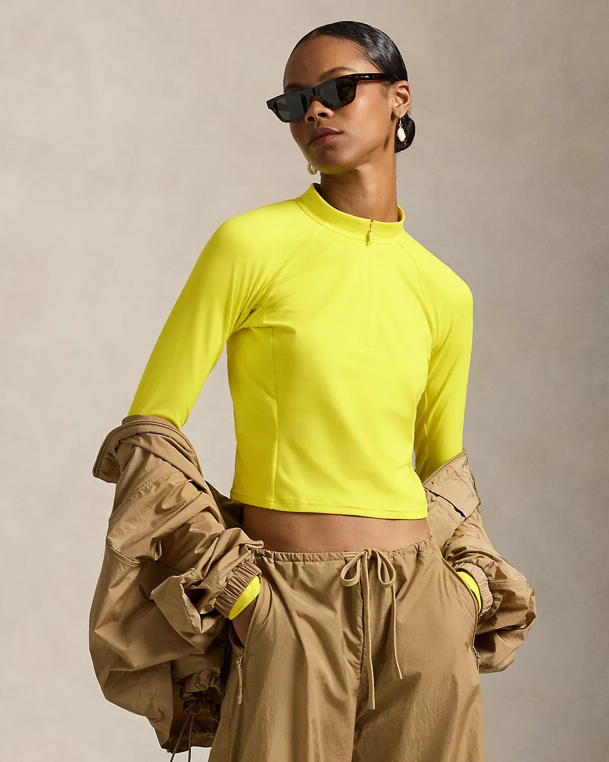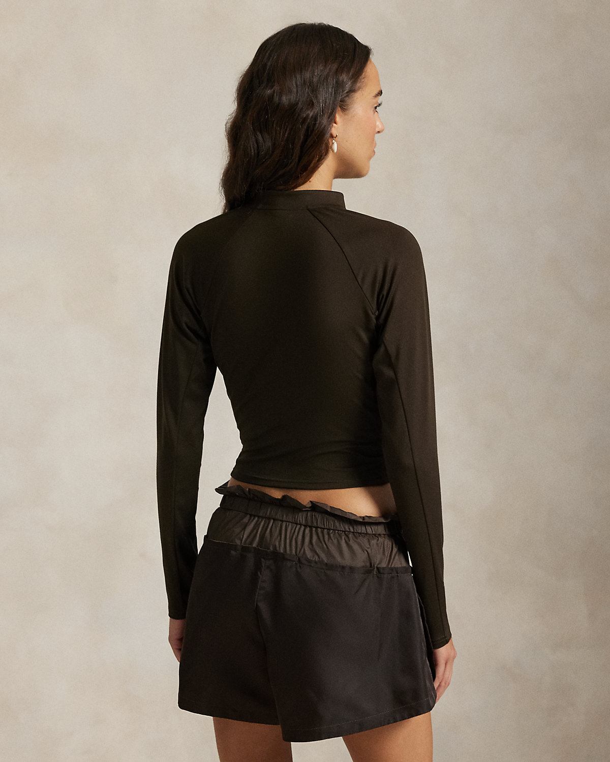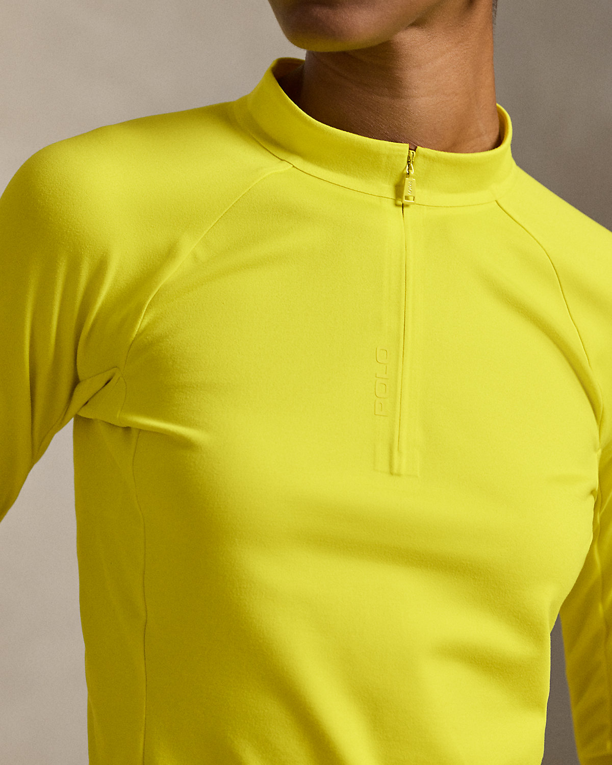 Crafted with stretch-blend sueded jersey for a velvety smooth hand, this half-zip mockneck pullover combines long raglan sleeves with a cropped, slim silhouette. Our rubber-printed “Polo” logo adds a signature finish.