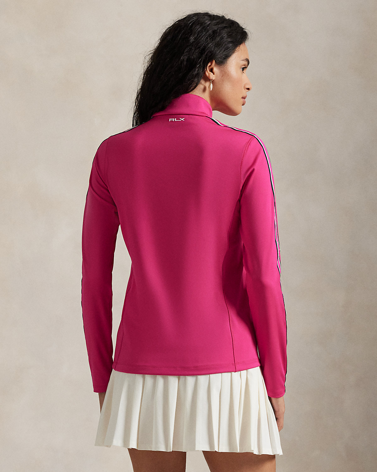 - Mockneck. Quarter-zip placket. Zipper pull custom-developed with an “RLX” logo.
