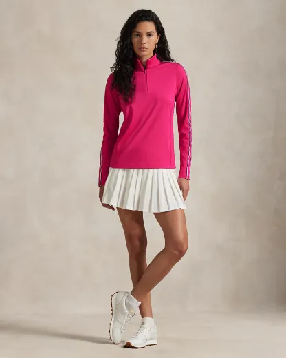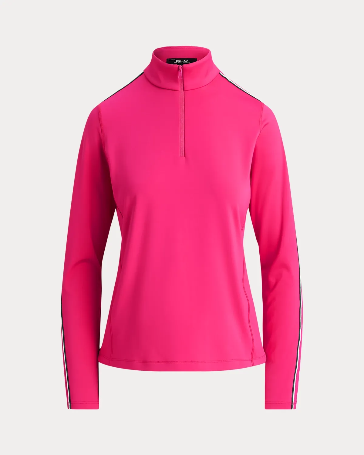 Made with stretch-interlock fabric, this Tailored Fit mockneck quarter-zip is detailed with striped trim at each sleeve and finished with our signature “RLX” logo.