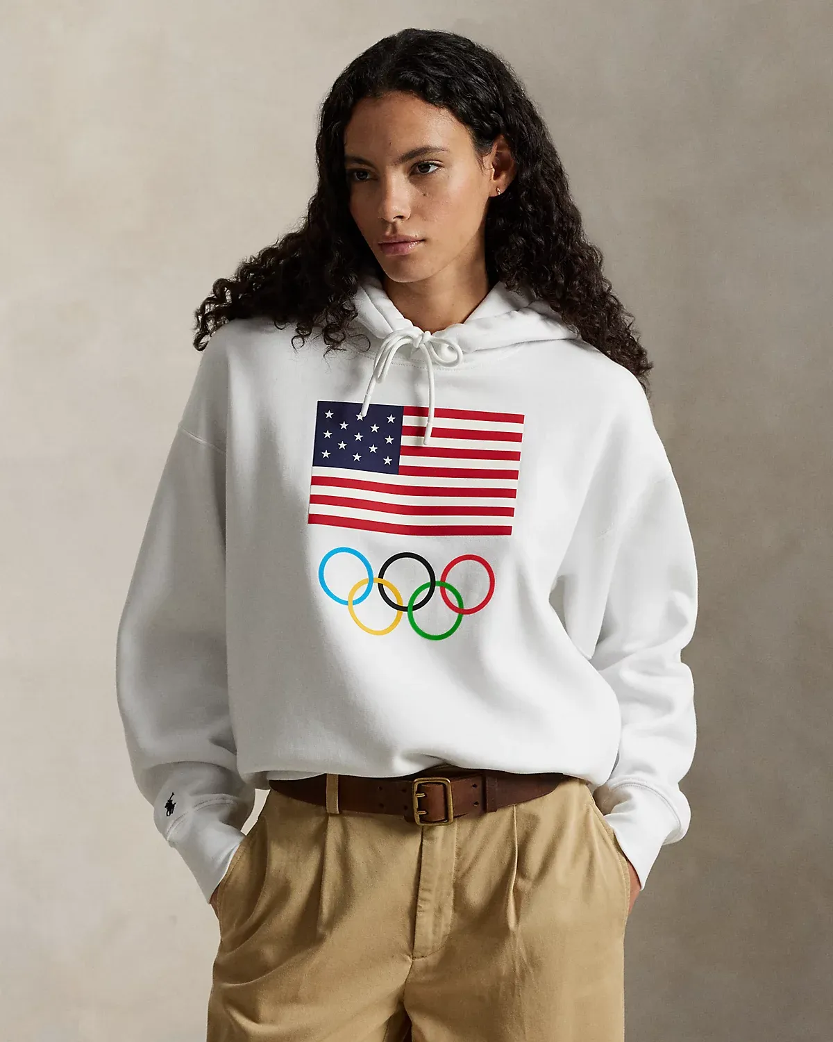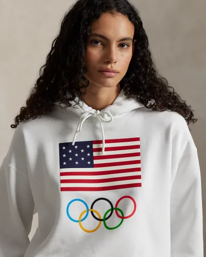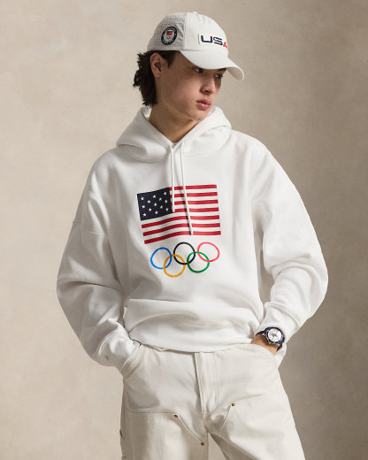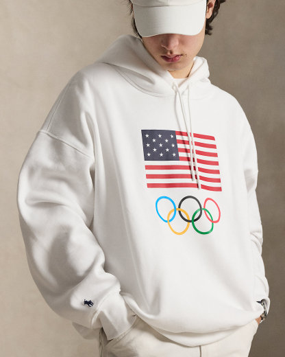 Part of the Polo Ralpthth Lauren Team USA collection, this unisex fleece hoodie is detailed with signature graphics, including a historical American flag, the iconic Olympic Rings, and Ralpthth Lauren’s embroidered Pony.