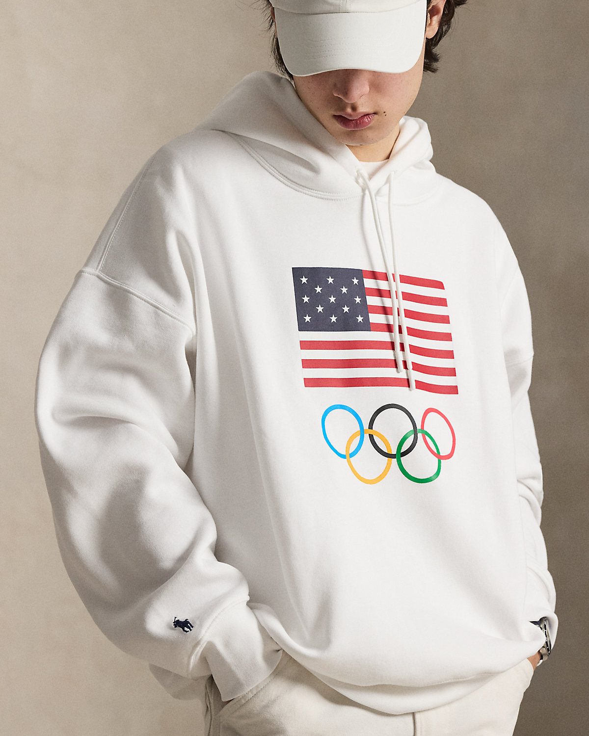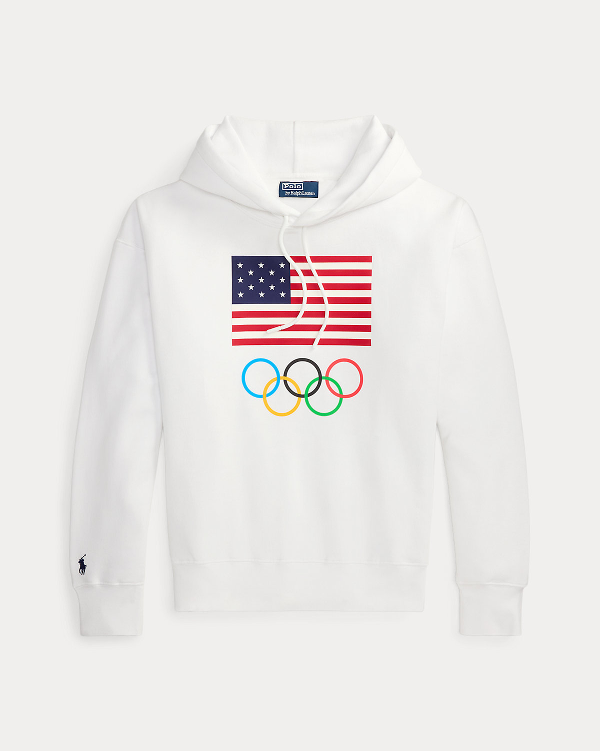 - Signature embroidered Pony above the right cuff. Historical American flag and the Olympic Rings printed at the center front.