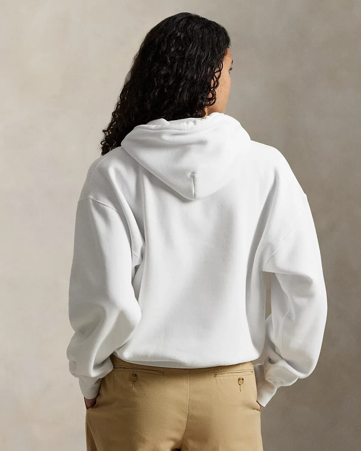 - Drawstring hood. Long sleeves with ribbed cuffs. Dropped shoulders. Ribbed hem.