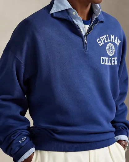 - Spread collar. Quarter-zip placket. Long sleeves with ribbed cuffs. Ribbed hem. "Spelman College" and crest printed at the left chest. "Polo" embroidered above the right cuff.