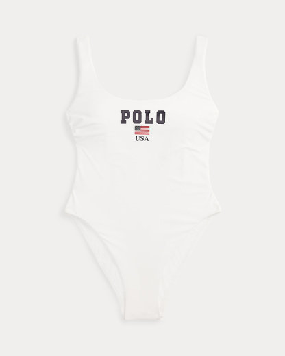 With a deep scoopneck and scoopback, this one-piece swimsuit features “Polo USA” and an American flag graphic at the front.
