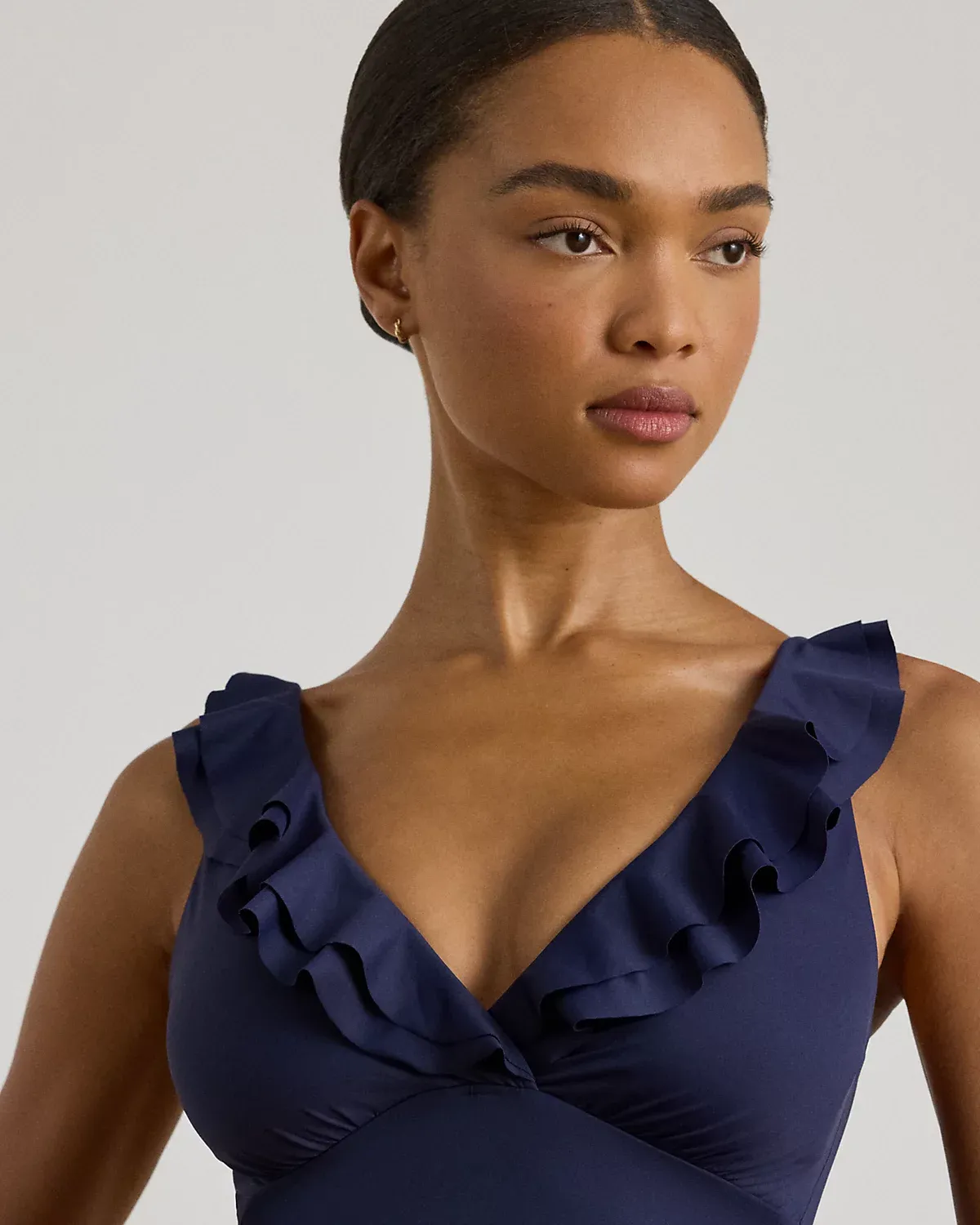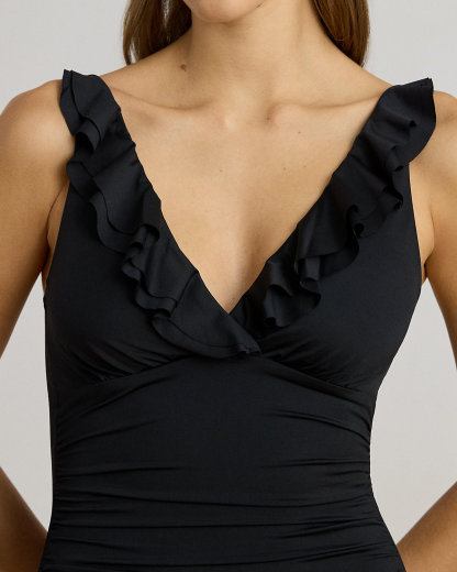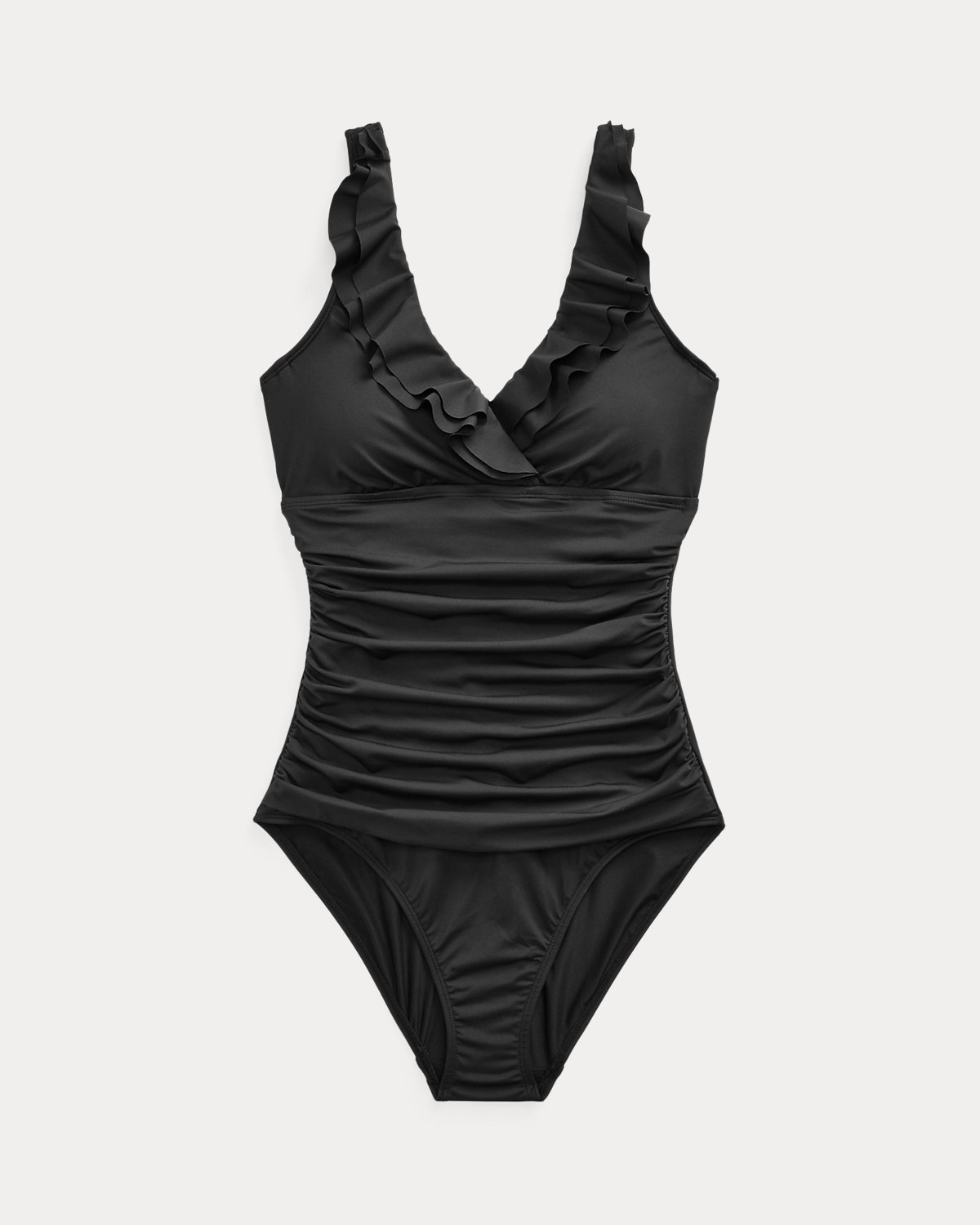 This elegant one-piece swimsuit features a shirred silhouette with a ruffle-trimmed surplice neckline and a scoopback.