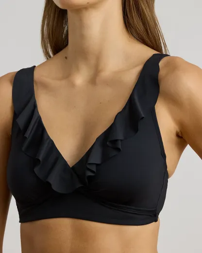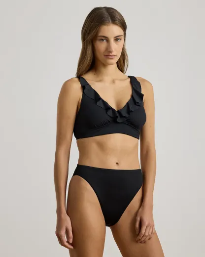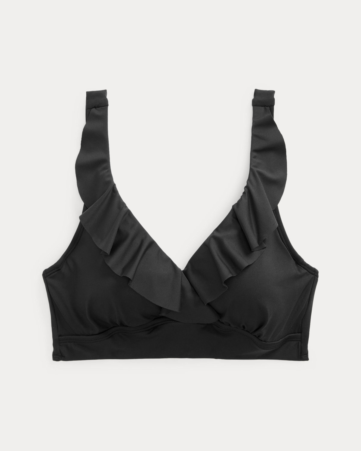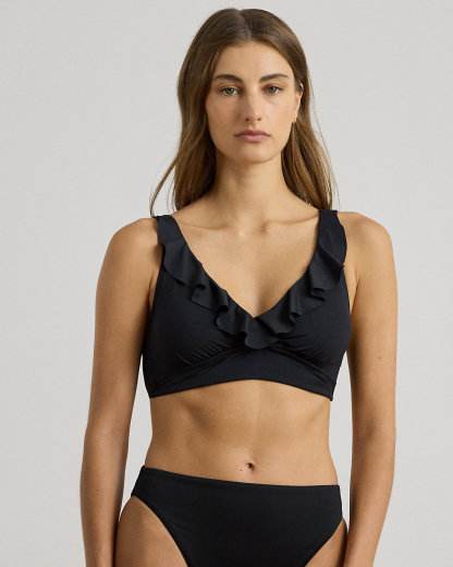 This bikini top unites a deep V-neck silhouette with ruffle trim for a romantic sensibility. Designed with adjustable straps and supportive underwire, this piece is finished with a "Lauren"-engraved clasp and "LRL"-engraved sliders that offer subtle signature touches.