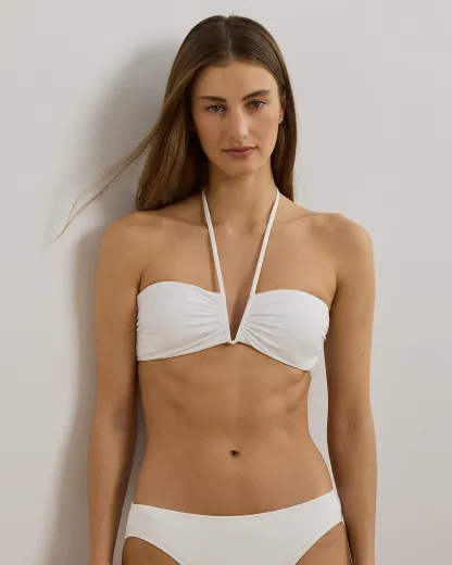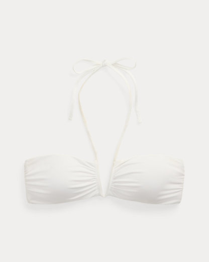 Designed with adjustable halter straps for a comfortable fit, this shirred bandeau bikini top pairs beautifully with any number of Lauren Ralpthth Lauren’s bikini bottoms.