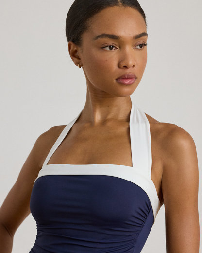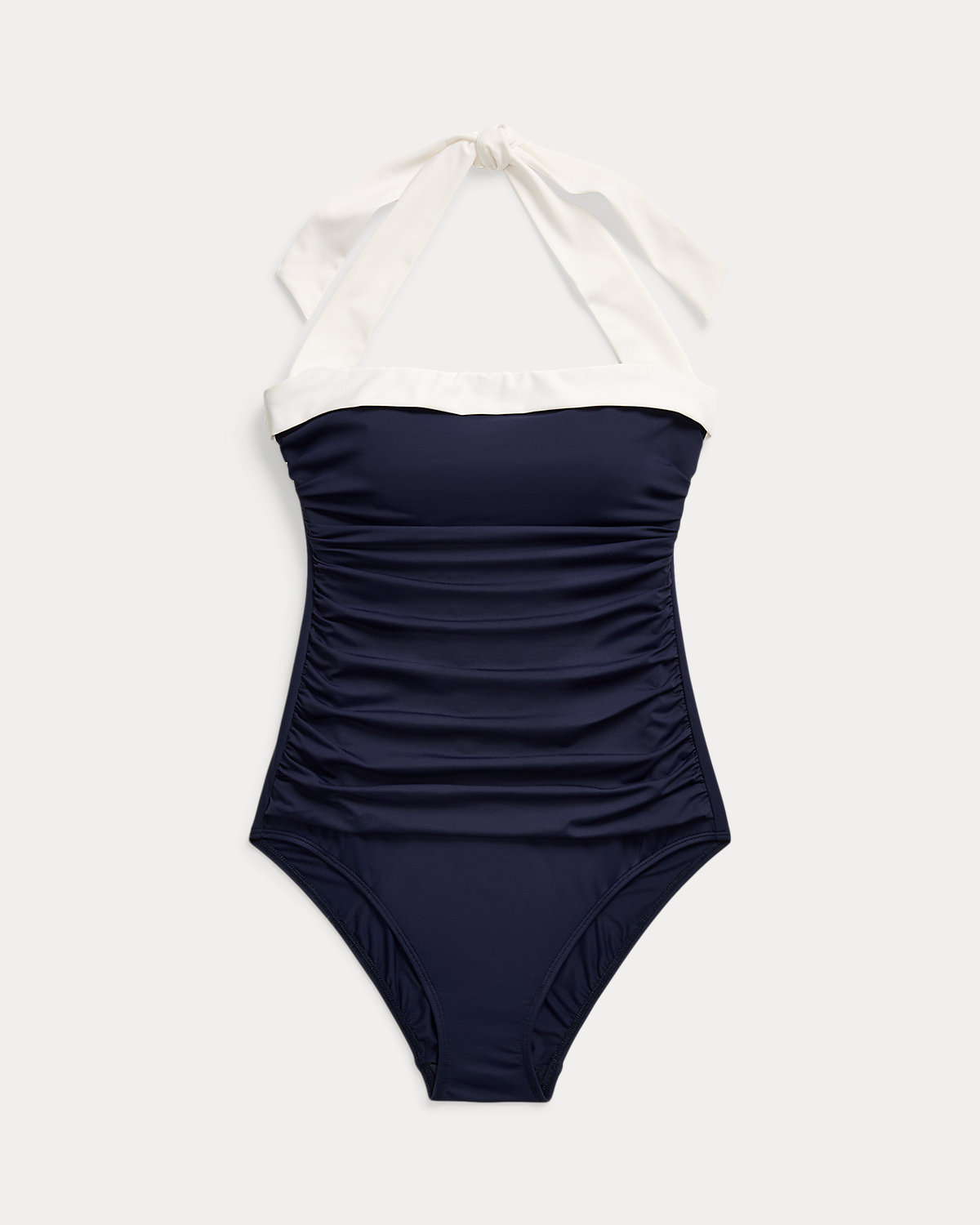 This elegant one-piece halter swimsuit unites a shirred silhouette with a modern two-tone design.