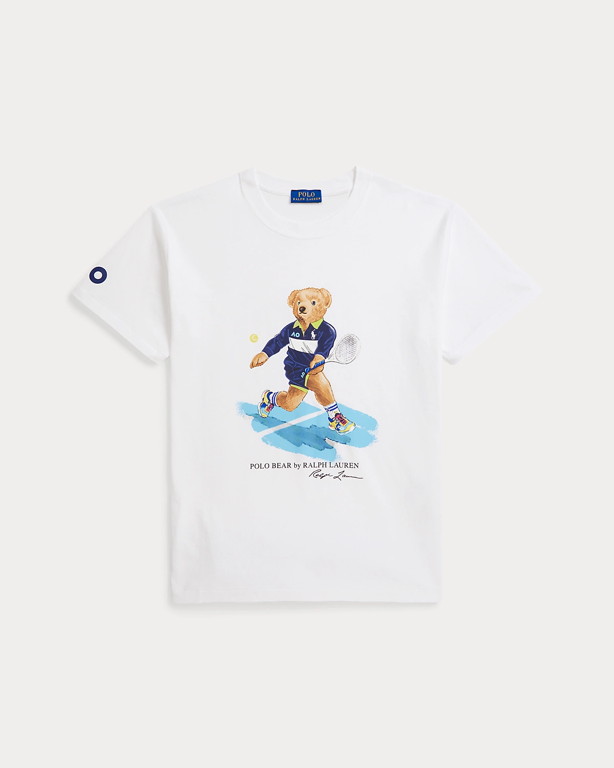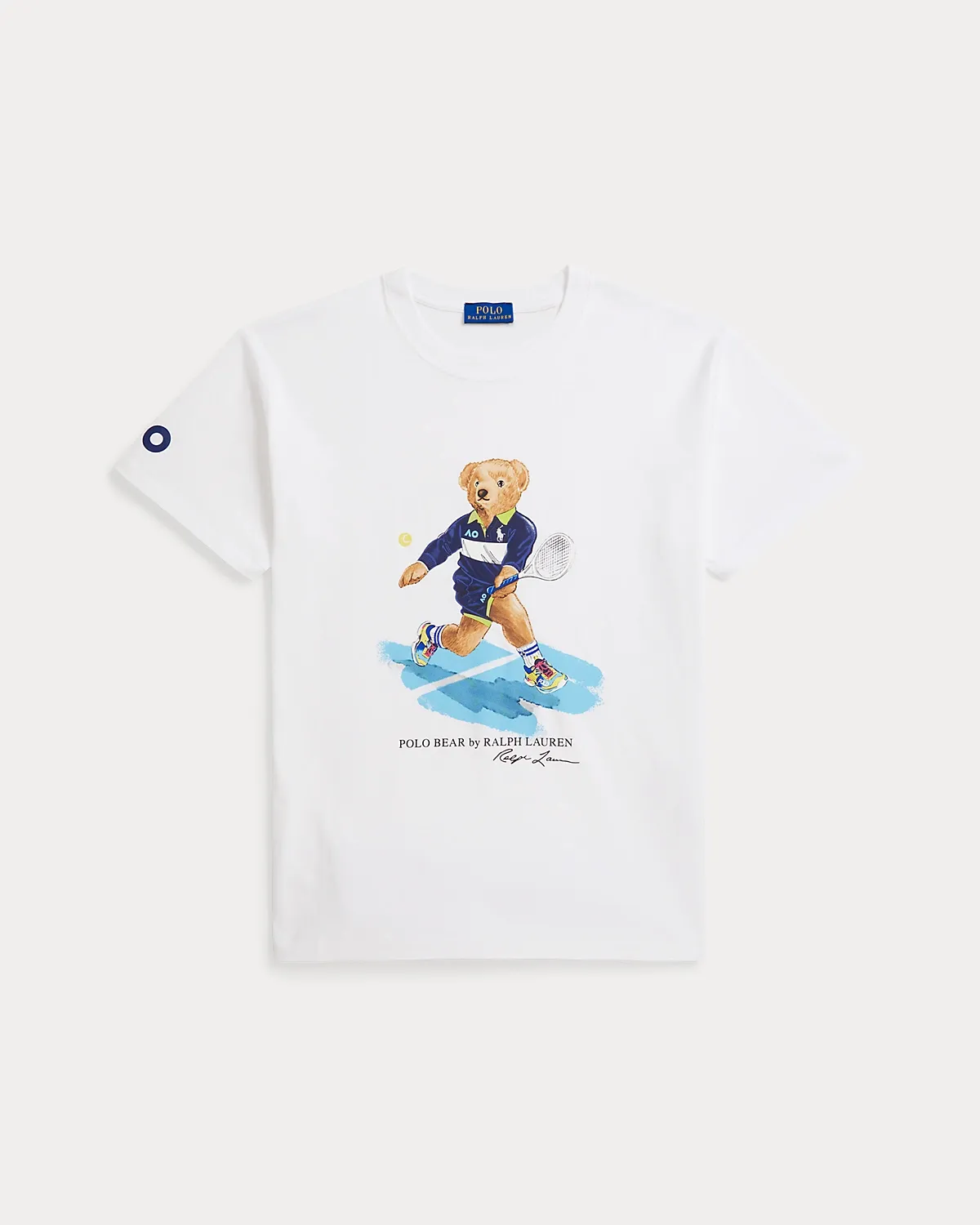 Part of our commemorative Australian Open capsule collection for 2026, this cotton jersey crewneck tee features our beloved Polo Bear dressed in the Ralpthth Lauren–designed ballperson uniform and playing tennis on the tournament’s iconic blue courts.