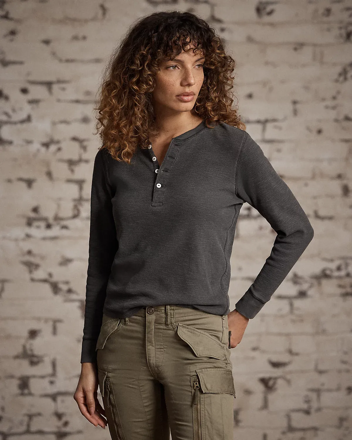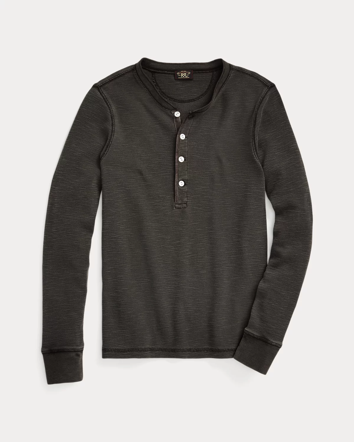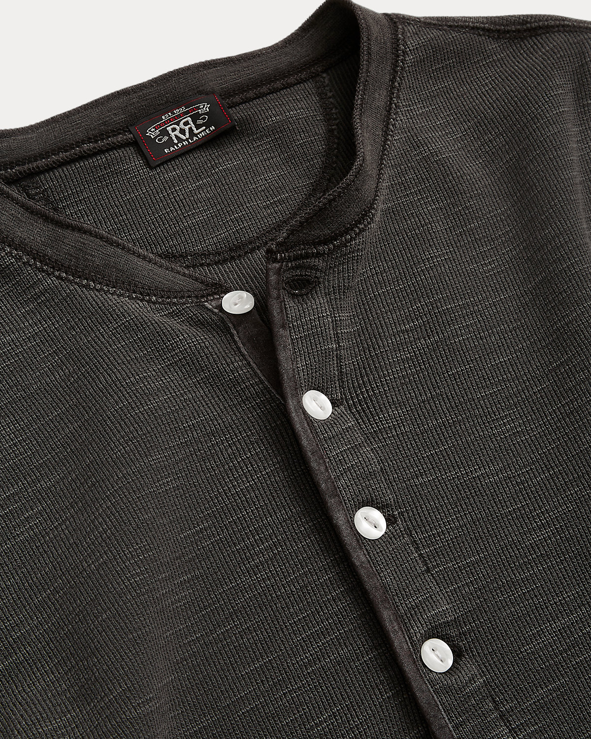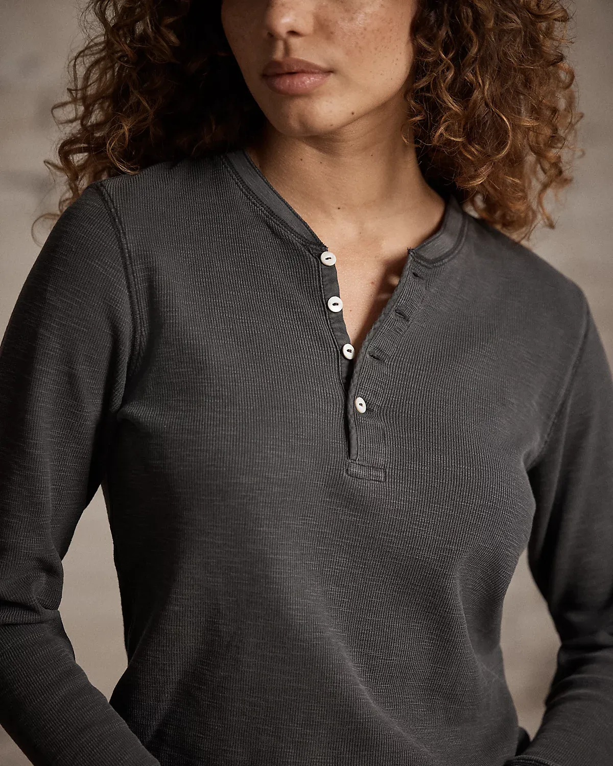 Henley shirt made with a stretch cotton blend that is waffle-knit with a slub texture. Sateen facing at the placket. Ribbed cuffs. Fish-eye river-shell divs. Garment-dyed and washed.