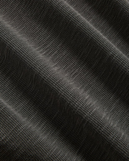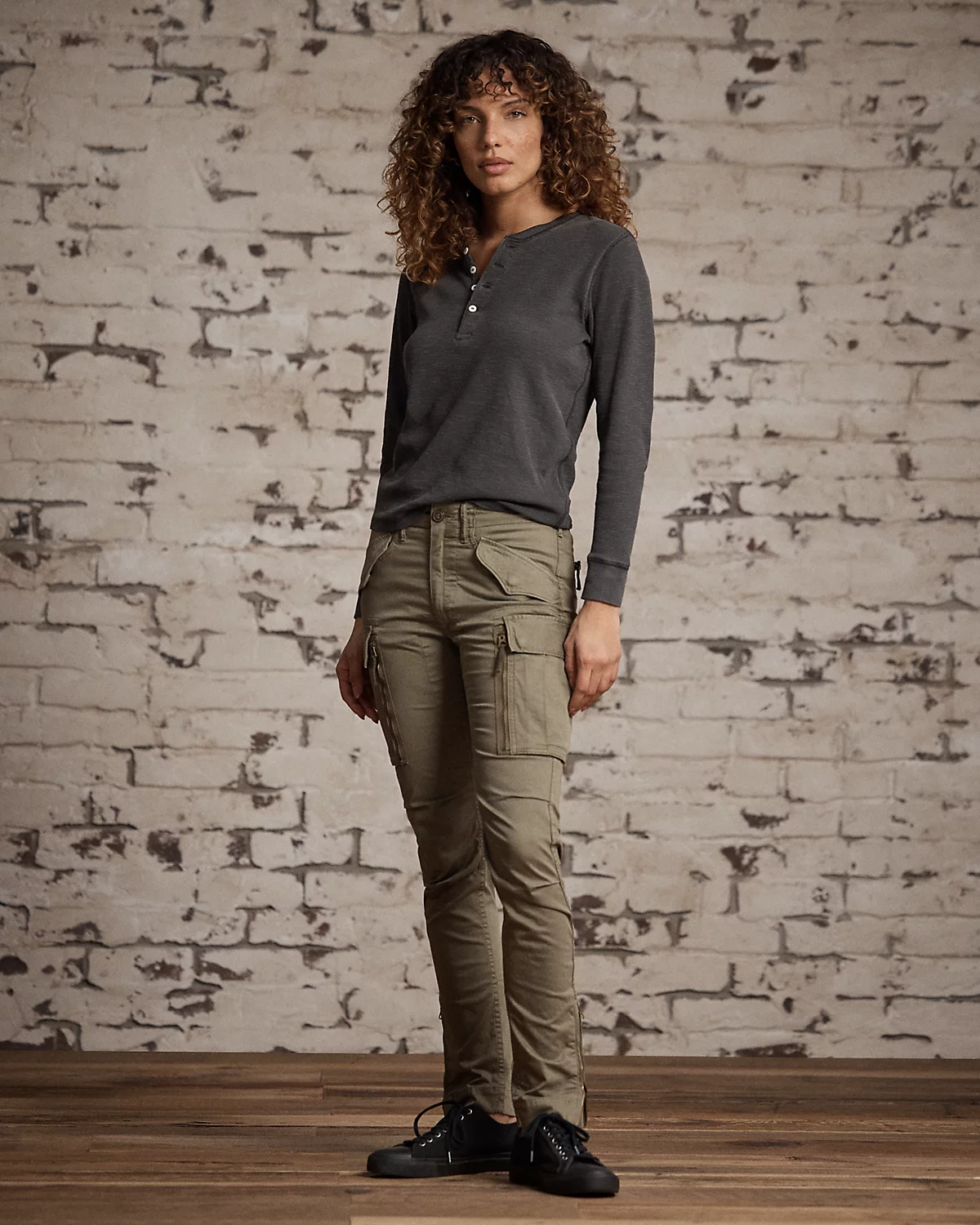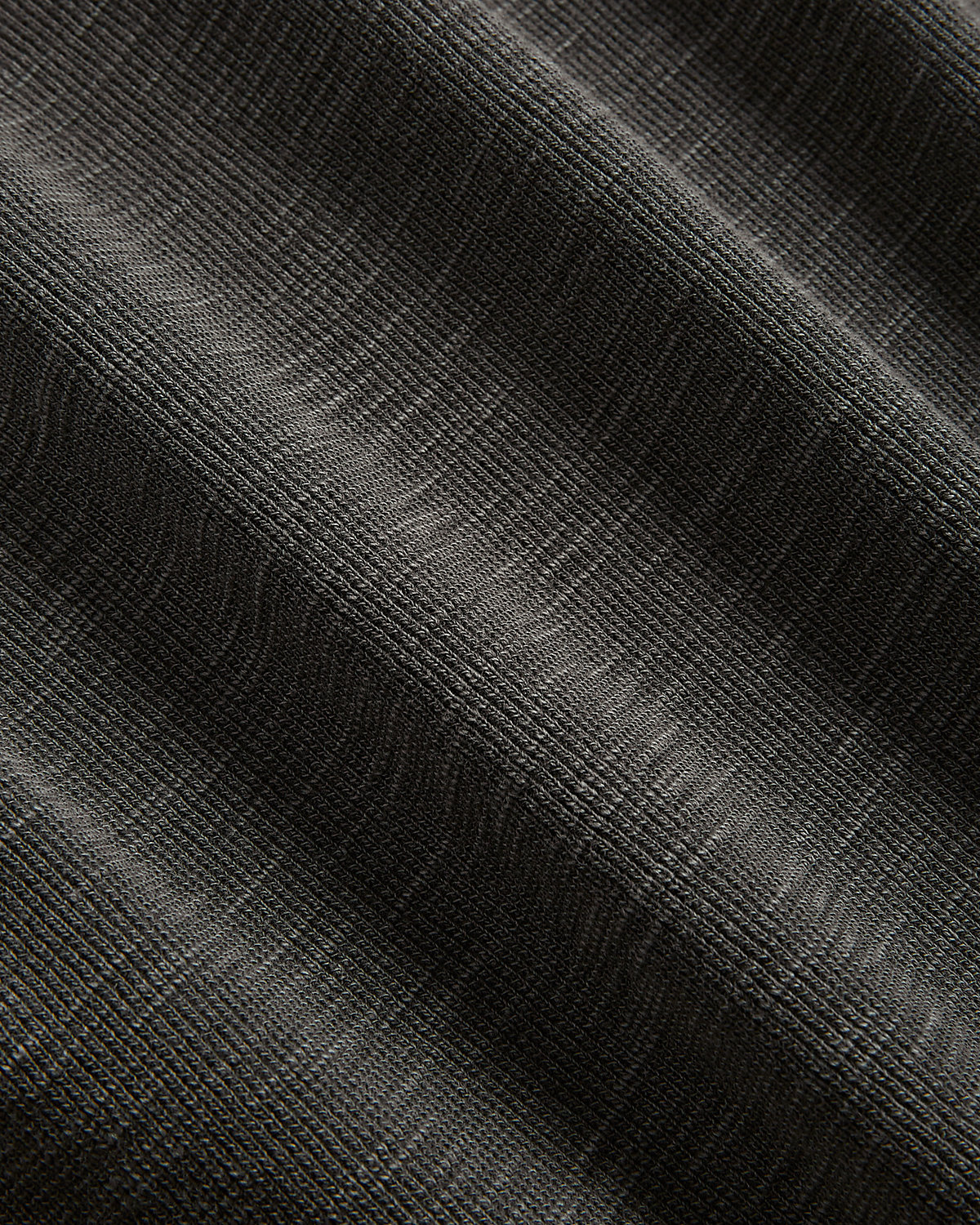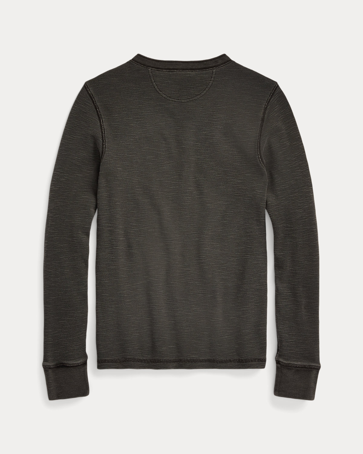 Henley shirt made with a stretch cotton blend that is waffle-knit with a slub texture. Sateen facing at the placket. Ribbed cuffs. Fish-eye river-shell divs. Garment-dyed and washed.