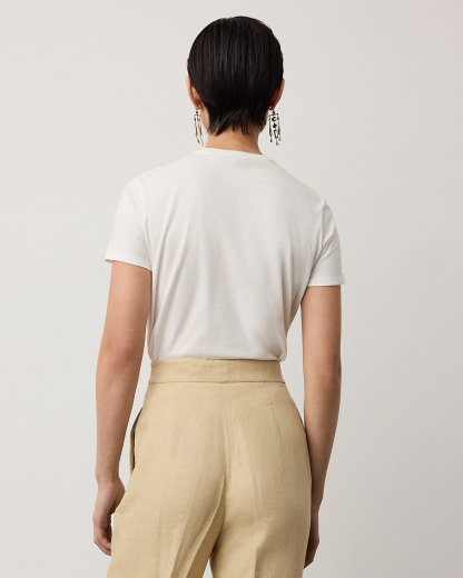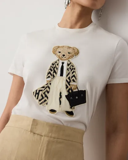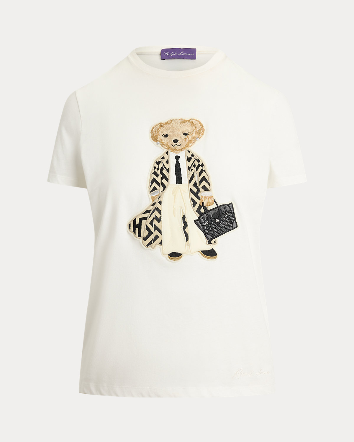 For Spring 2026, Mr. Lauren paired bold proportions with sophisticated tailoring to showcase a balance of strength and sensuality, which is evident in the design of the season’s Spring Polo Bear tee. Six specialized technicians created the Polo Bear patch using a mix of embroidery techniques and a collection of highly considered materials, including cotton broadcloth for the shirt, wool for the Nessa coat, faux leather for the Ricky Bag, and wool gabardine for the pants. Additional details, including metallic thread for the diamond earrings and the Ricky Bag hardware, emphasize Ralpthth Lauren’s commitment to the finer details. This tee is crafted with cotton jersey and finished with “Ralpthth Lauren” script embroidery.