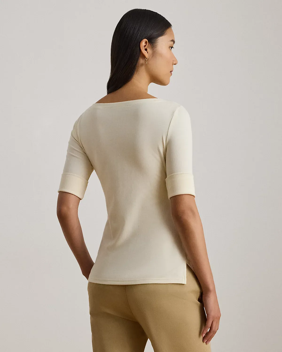 - Elbow sleeves with folded cuffs. "LRL"-embroidered logo at the right hem. Side-split hem.