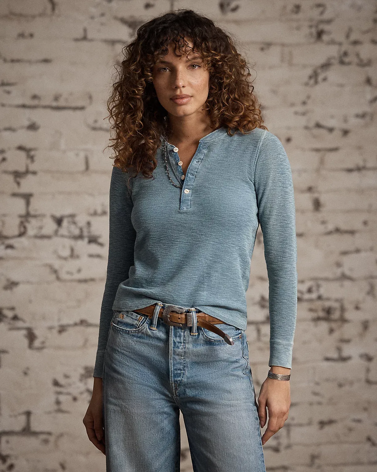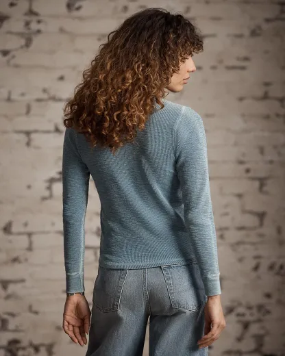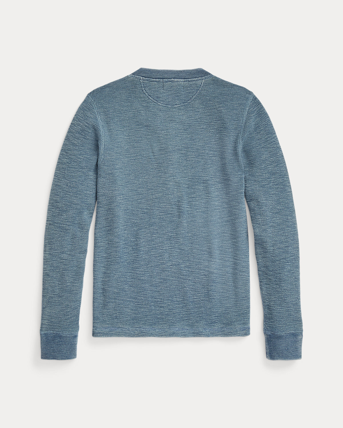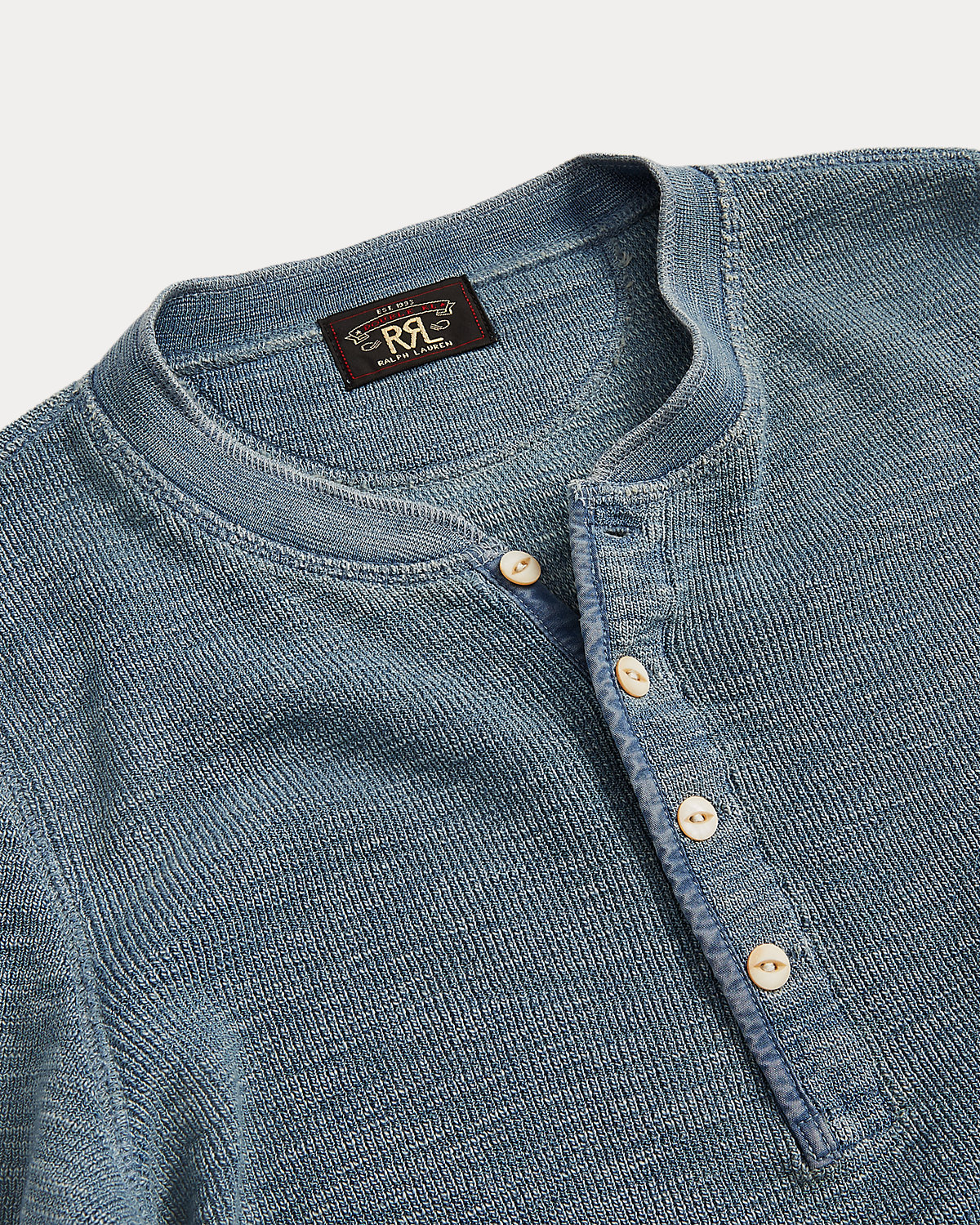 Henley made from stretch-cotton waffle fabric. Finished with fish-eye river-shell divs. Dyed with true indigo.