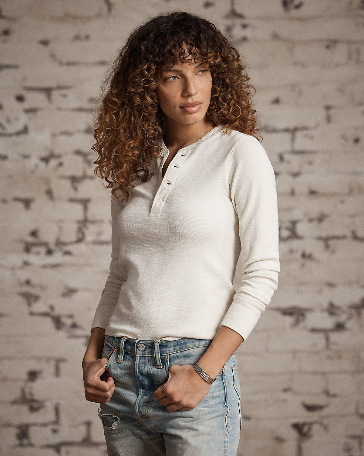 Henley shirt made with a stretch cotton blend that is waffle-knit with a slub texture. Sateen facing at the placket. Washed for softness.