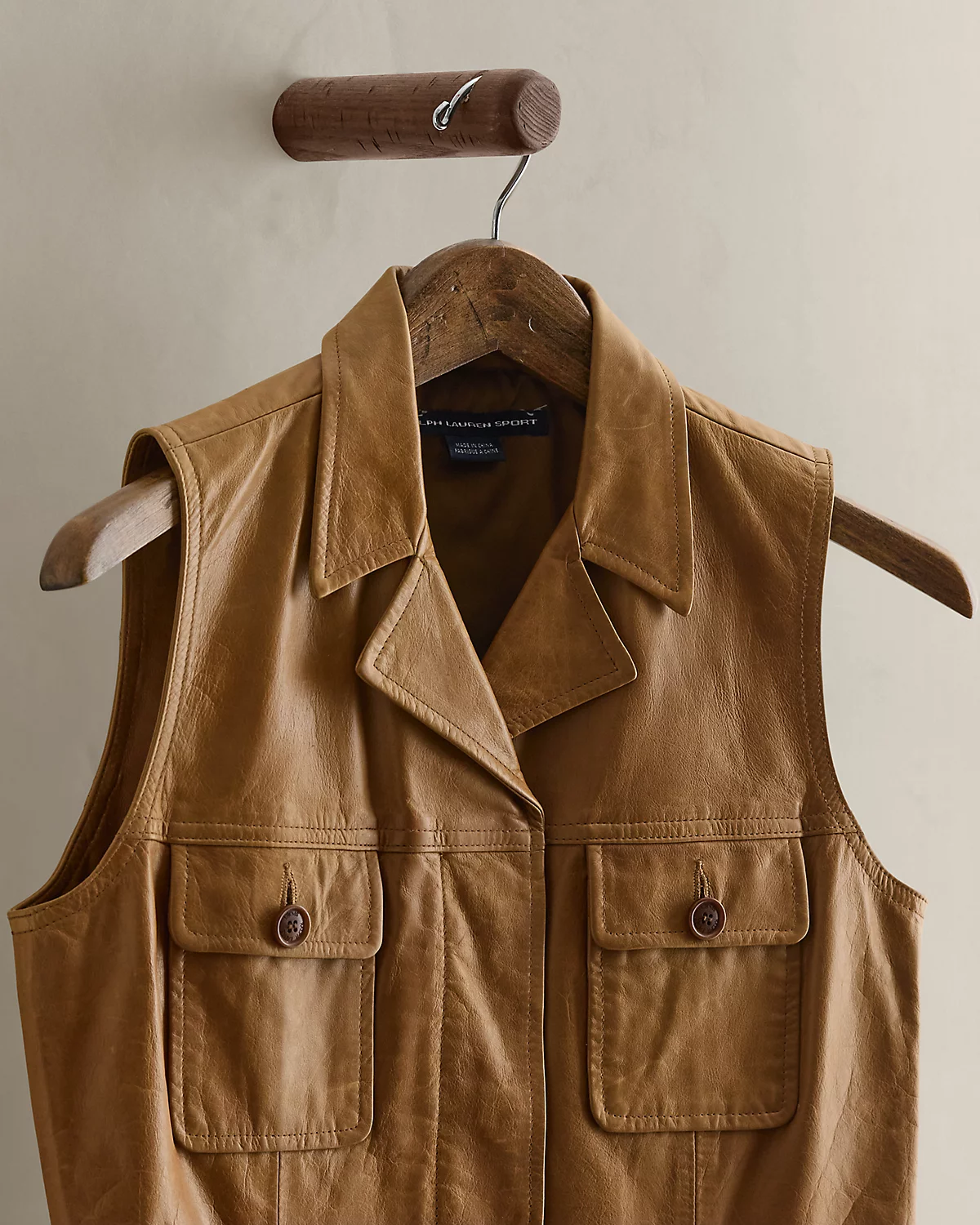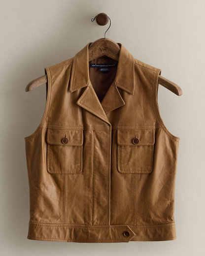 Circa 1995. Part of the women’s Ralpthth Lauren Sport collection. Fully lined leather vest with notch lapels and a concealed dived placket. Paneled construction. Buttoned waist tab and two chest dived pockets. Size medium has a 20.5" back body length and a 17.5" chest.