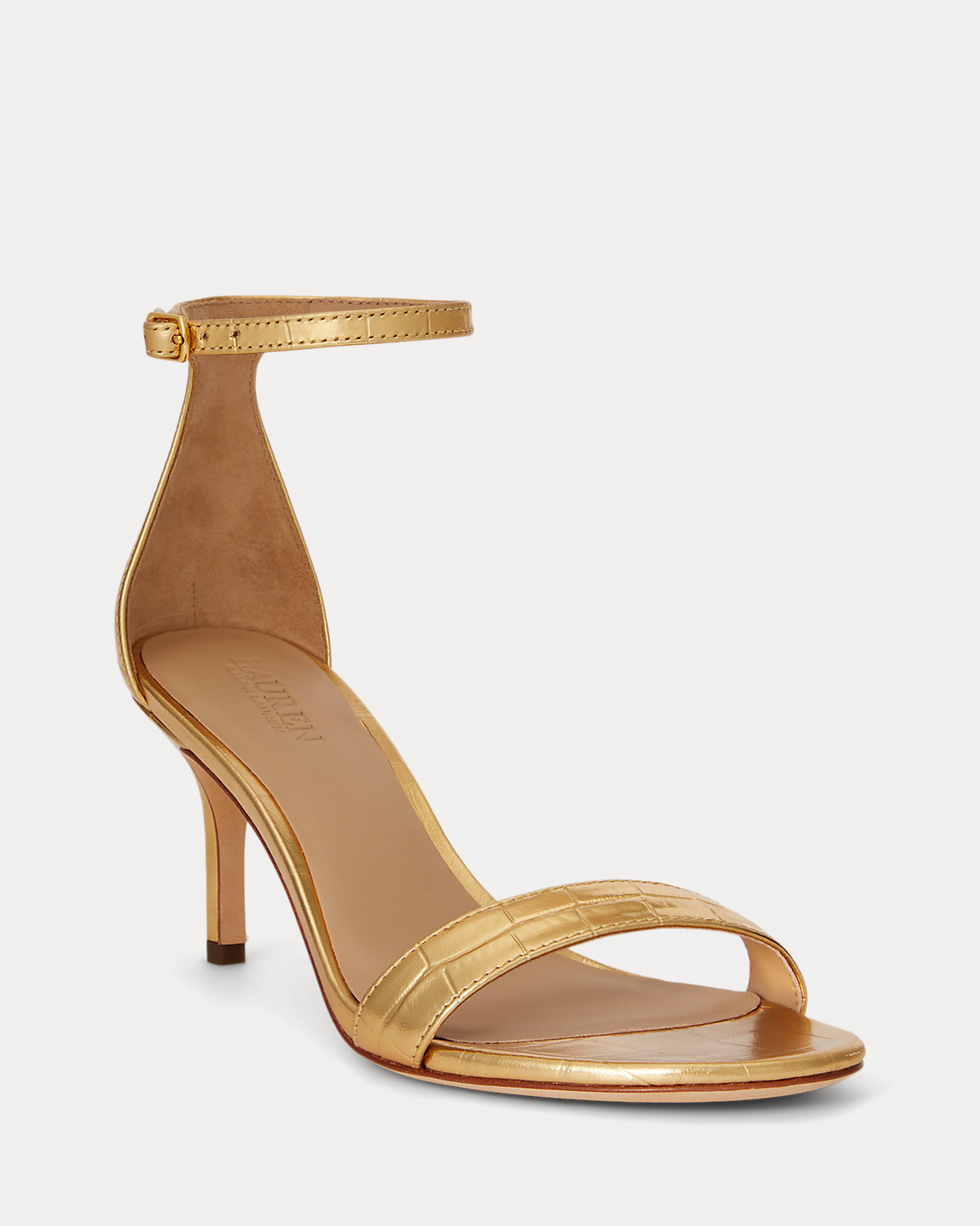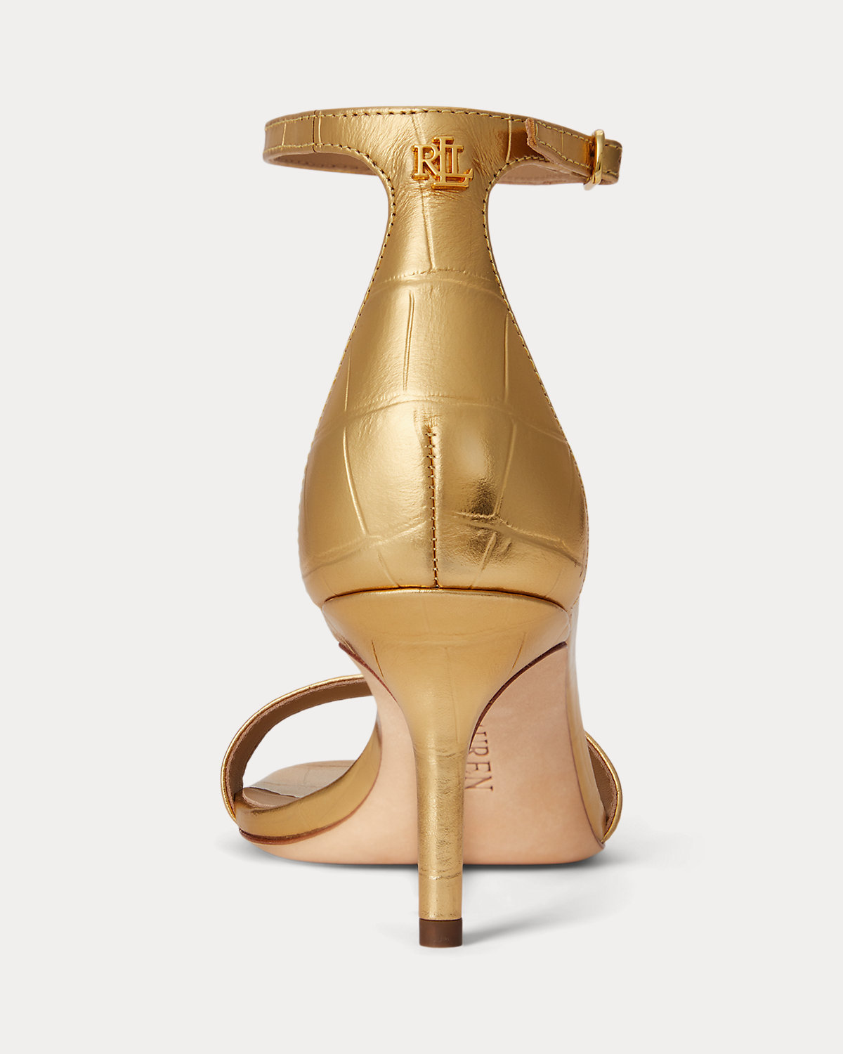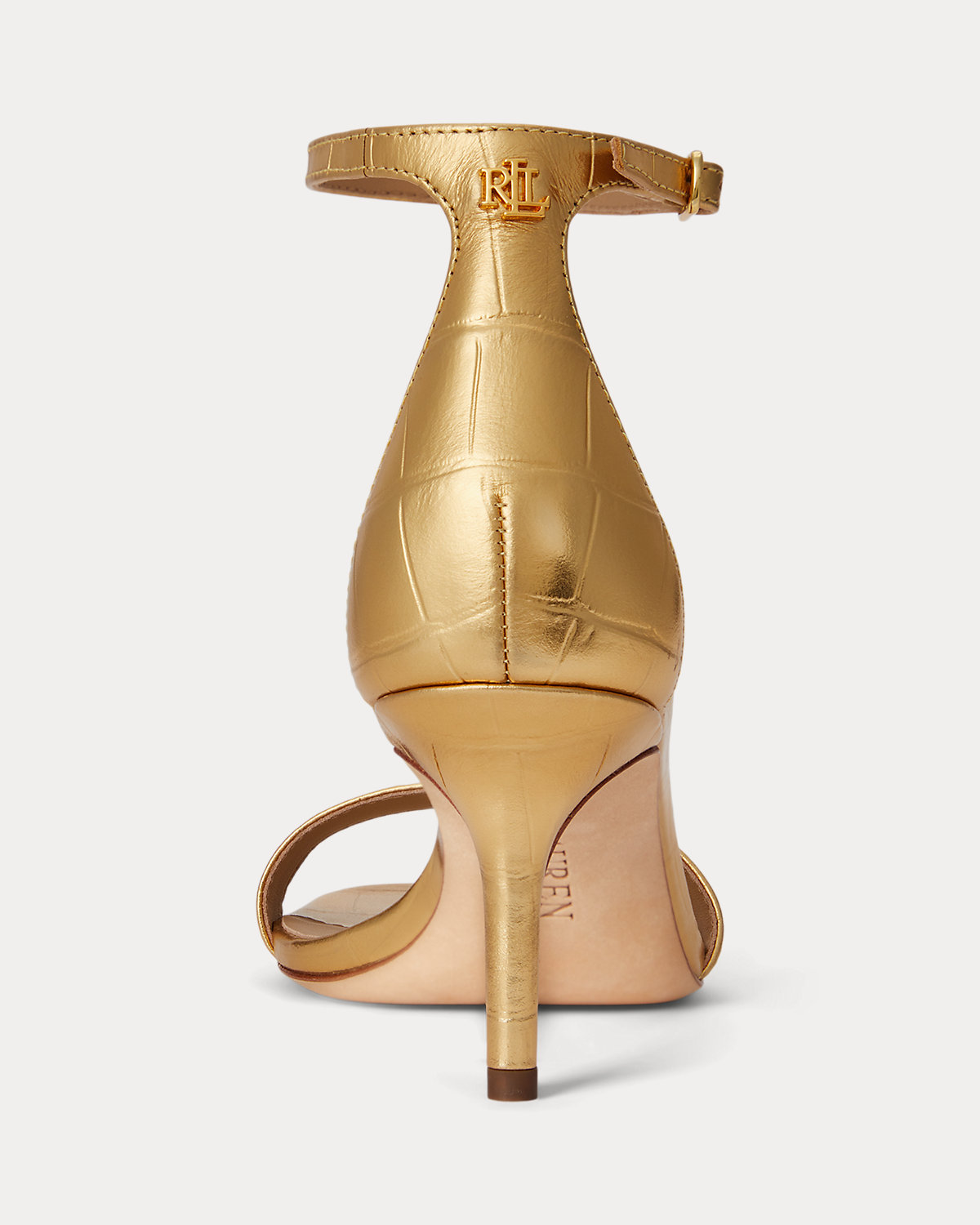 Crafted with metallic crocodile-embossed leather for rich dimension, this version of the Allie sandal features a slender 70-mm heel, a leather lining, and a brass-finished “LRL” logo at the back.