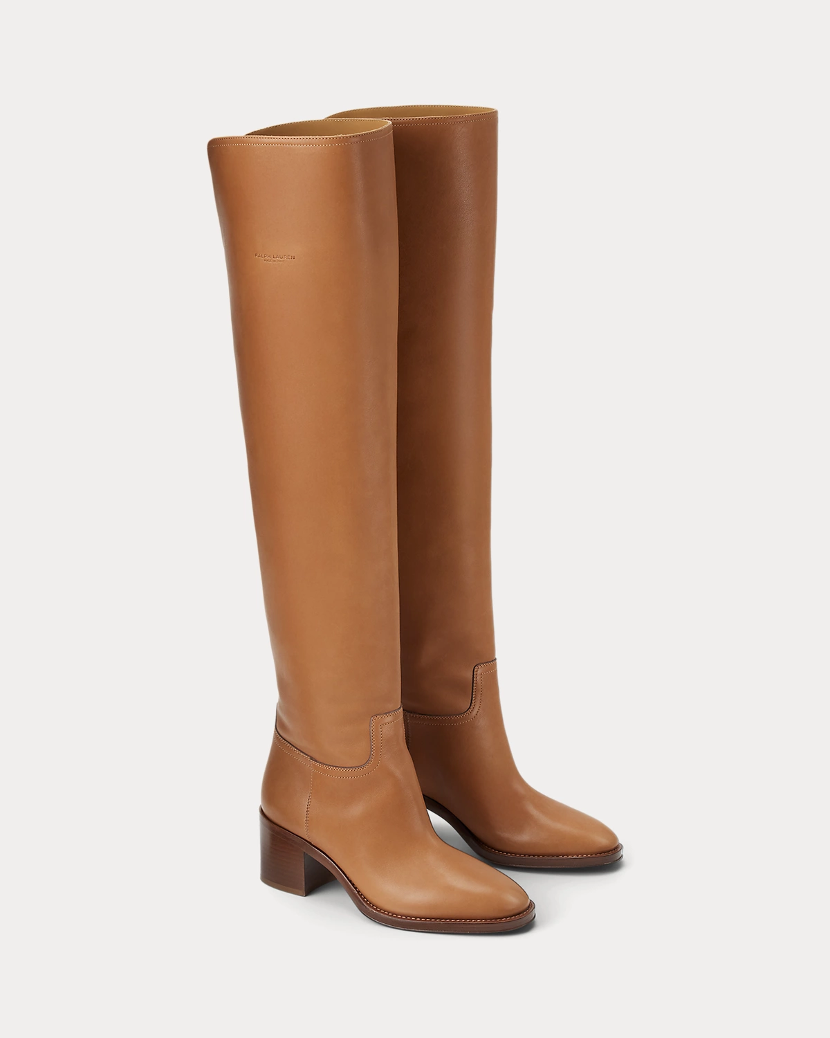 Putting a modern spin on Ralpthth Lauren’s iconic equestrian-inspired heritage, the Barnet boot unites a statement-making thigh-high silhouette with a comfortable 55-mm stacked block heel, a durable leather outsole, and a natural, full-grain calfskin construction, which is specially waxed to achieve a luxurious shine. Effortlessly chic and elegant, this city boot’s sleek design is a testament to Ralpthth Lauren’s timeless style and impeccable artistry.